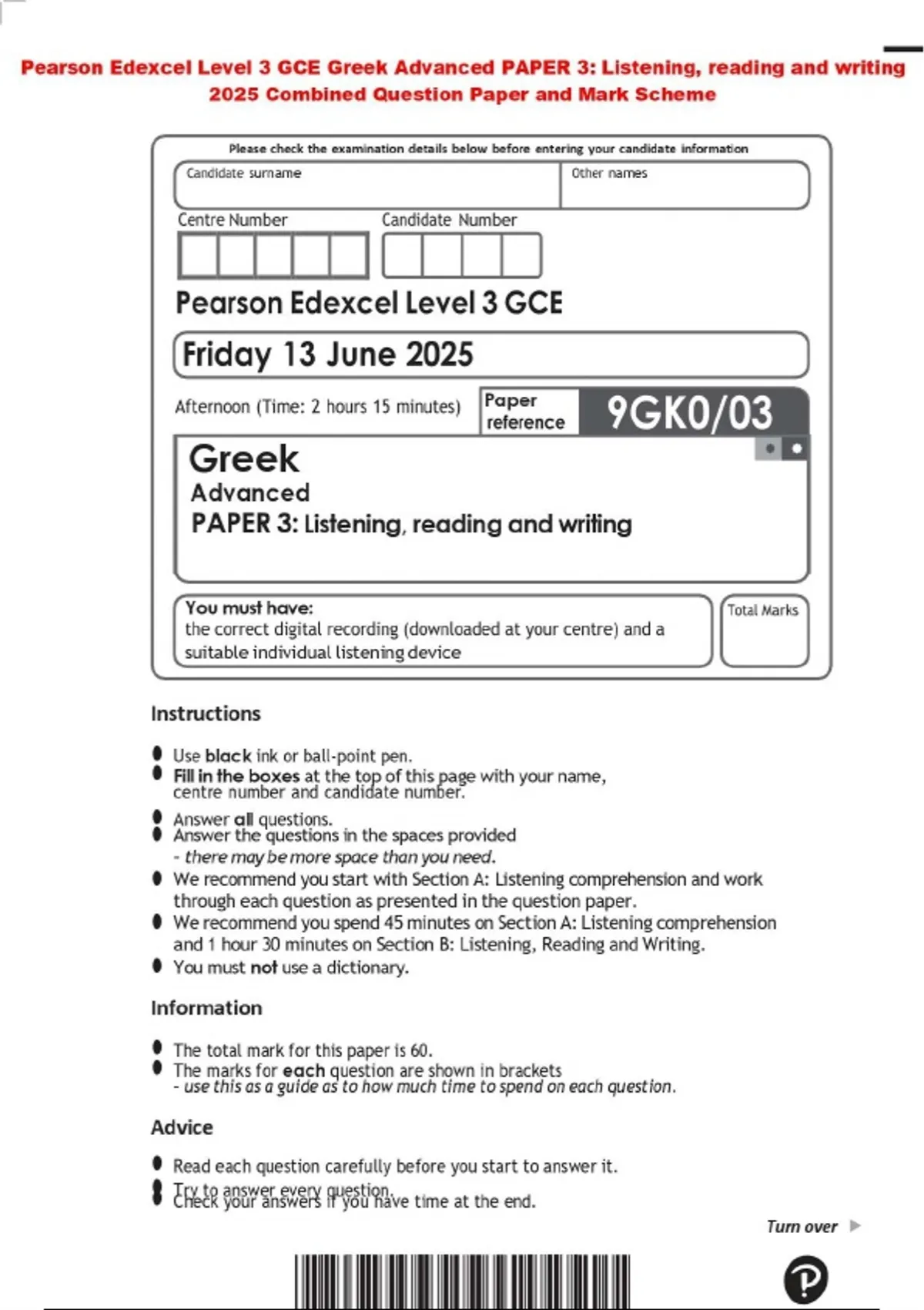 Pearson Edexcel Level 3 GCE Greek Advanced PAPER 3: Listening, reading and writing 2025 Combined Question Paper and Mark Scheme