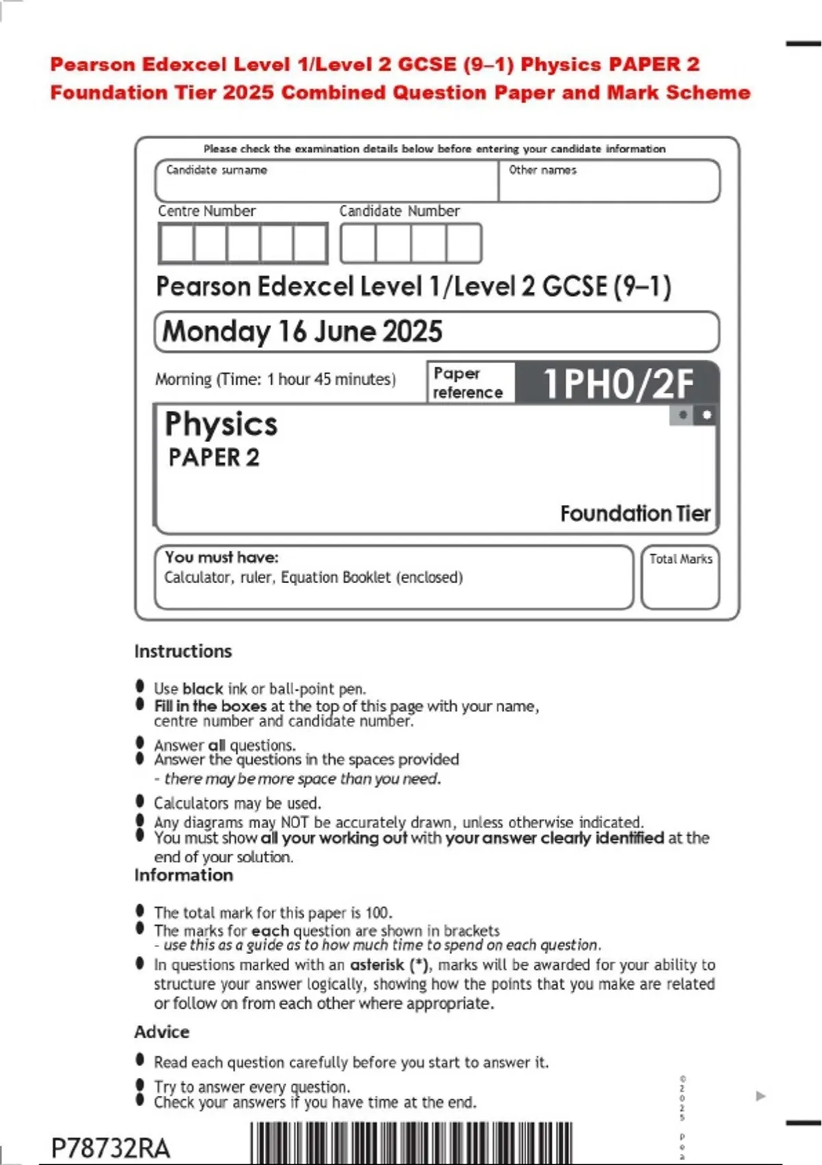 Pearson Edexcel Level 1/Level 2 GCSE (9–1) Physics PAPER 2 Foundation Tier 2025 Combined Question Paper and Mark Scheme