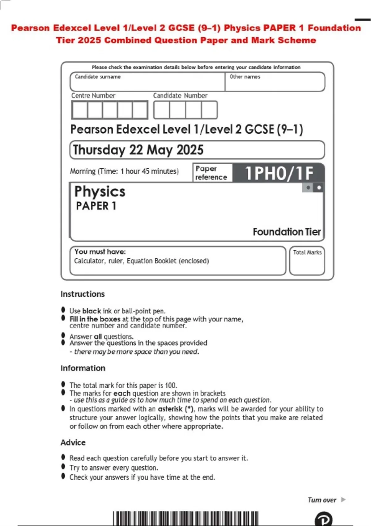 Pearson Edexcel Level 1/Level 2 GCSE (9–1) Physics PAPER 1 Foundation Tier 2025 Combined Question Paper and Mark Scheme