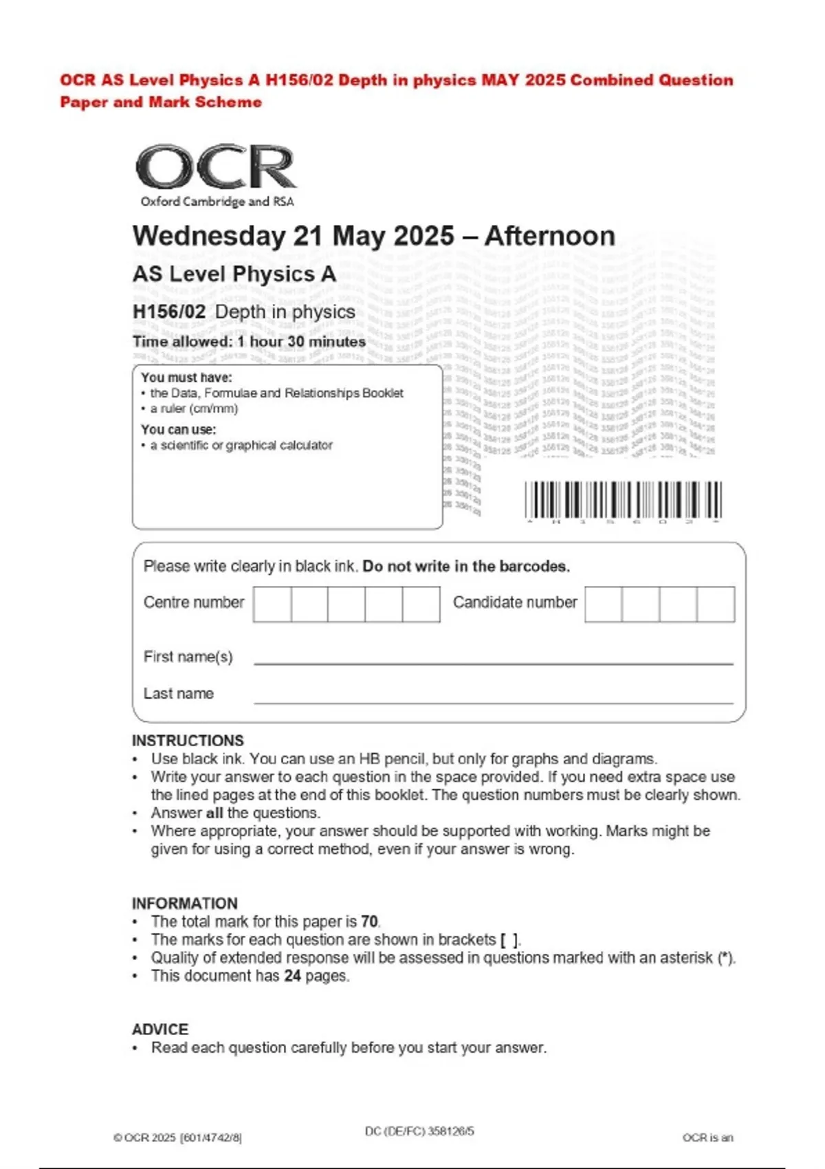 OCR AS Level Physics A H156/02 Depth in physics MAY 2025 Combined Question Paper and Mark Scheme