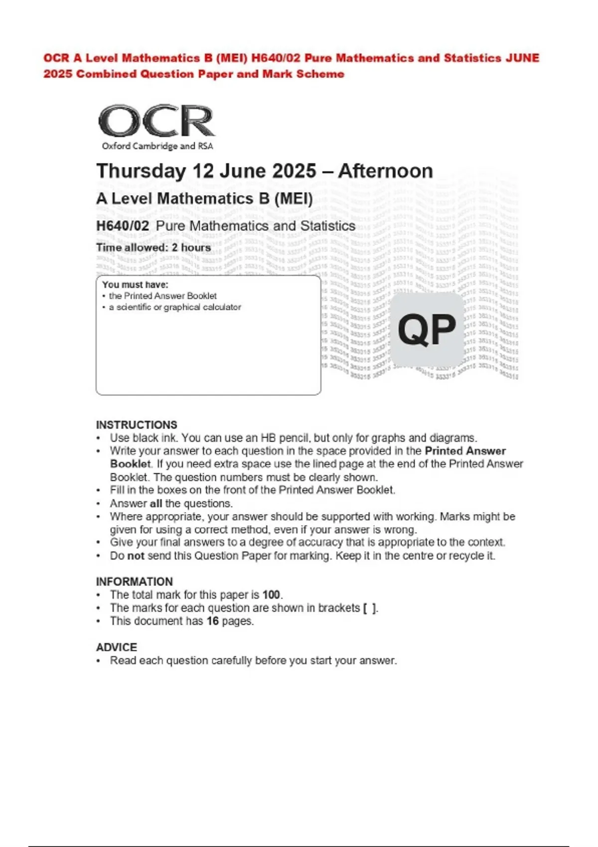 OCR A Level Mathematics B (MEI) H640/02 Pure Mathematics and Statistics JUNE 2025 Combined Question Paper and Mark Scheme