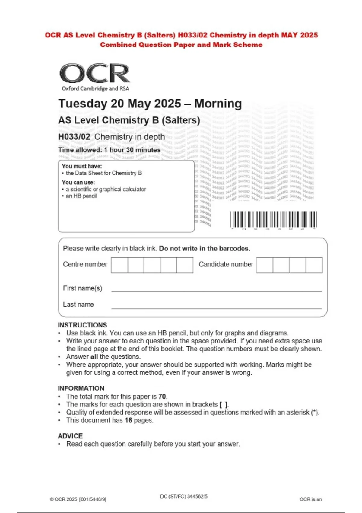 OCR AS Level Chemistry B (Salters) H033/02 Chemistry in depth MAY 2025 Combined Question Paper and Mark Scheme