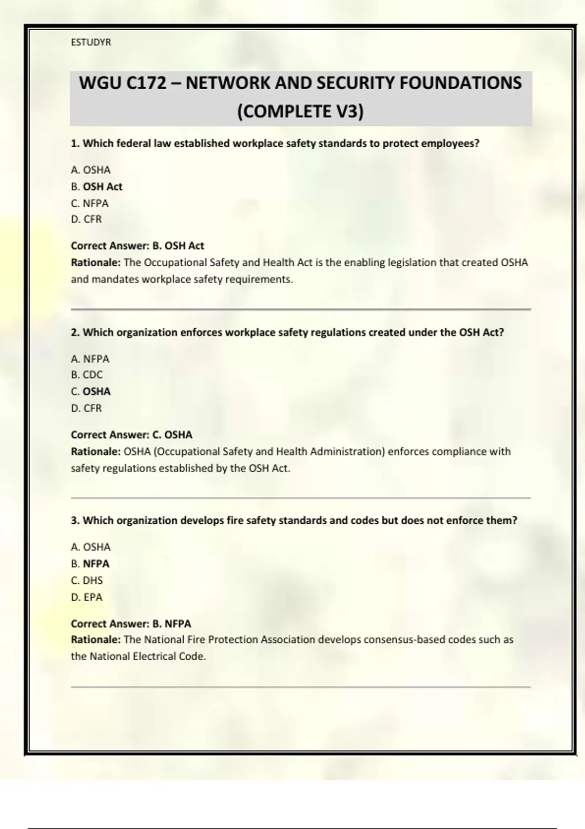 This comprehensive C172 study resource is designed specifically for Western Governors University (WGU) – Network and Security Foundations students preparing for the OA exam. The material includes 125 intensively structured, exam-style multiple-choice questions, each with: • Clearly highlighted correct answers • Concise yet thorough rationales explaining why the answer is correct • Accurate terminology aligned with WGU C172 competencies Coverage Includes: Security laws and regulations (HIPAA, FERPA, GLBA, FISMA, PCI DSS) Policies, standards, and procedures (SOP, SLA, MSA, AUP, IR lifecycle) Backup strategies, disaster recovery, and high availability Virtualization, hypervisors, cloud models, and service types Storage technologies (SAN, NAS, iSCSI, Fibre Channel, Infiniband) Network attacks, threats, and mitigation techniques Firewalls, IDS/IPS, VPN types, tunneling, and AAA Encryption, hashing, IPSec, VPN protocols, and authentication methods Why This Resource Works This guide is not copied from Quizlet or flashcards. It is fully regenerated into exam-focused MCQs that reflect how questions are actually presented on the WGU Objective Assessment. Ideal for: Final exam revision Practice testing Concept reinforcement Perfect for students who want a structured, high-yield resource to pass C172 confidently on the first attempt.