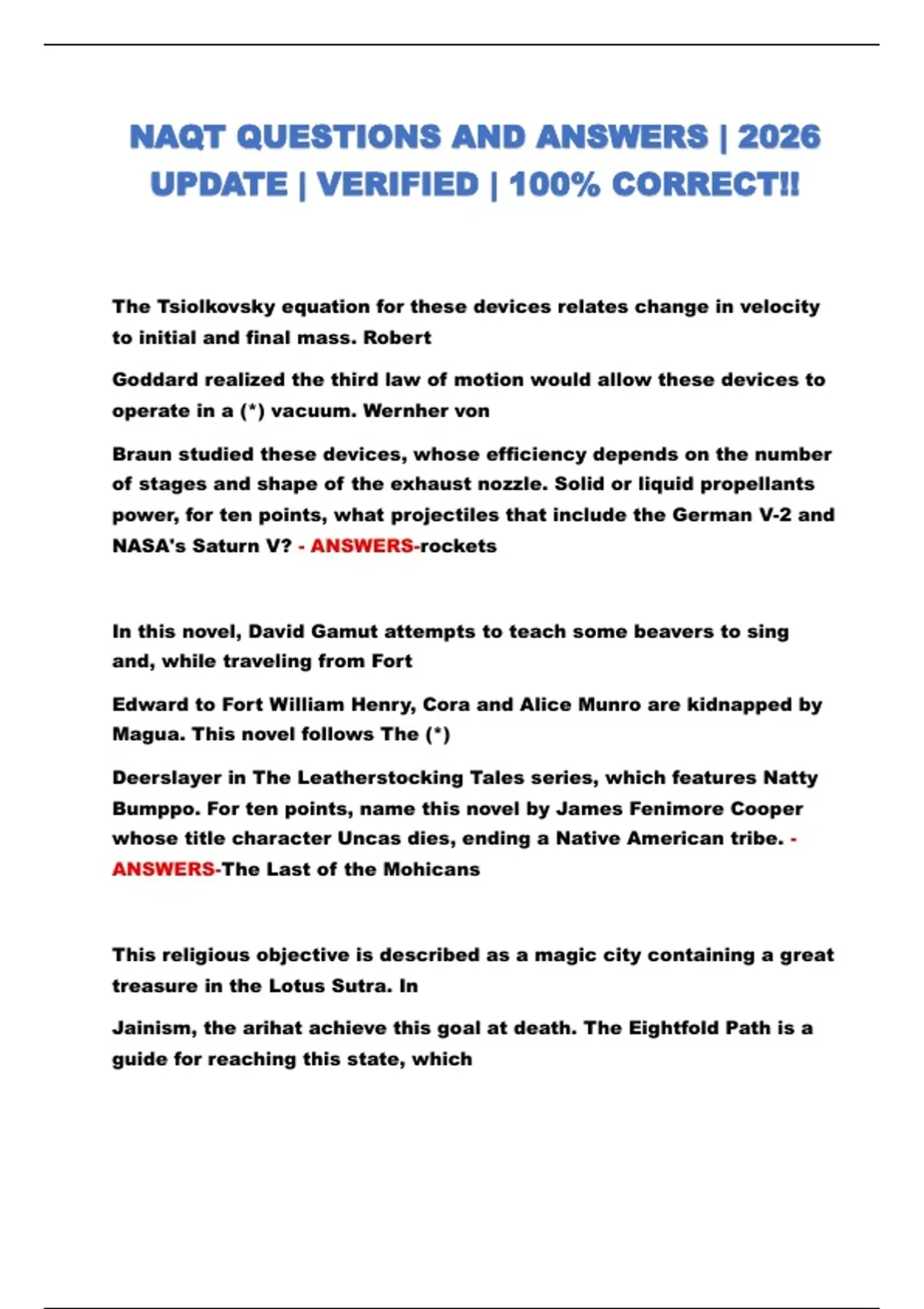 NAQT QUESTIONS AND ANSWERS | 2026 UPDATE | VERIFIED | 100% CORRECT!!