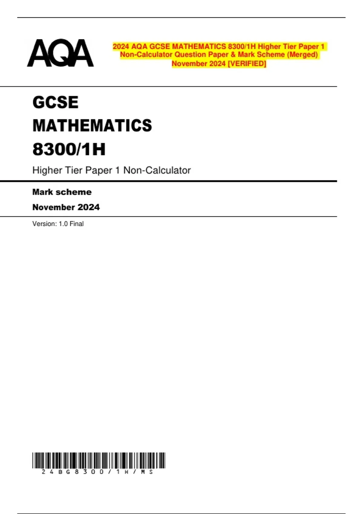 , MARK SCHEME – GCSE MATHEMATICS – 8300/1H – NOVEMBER 2024