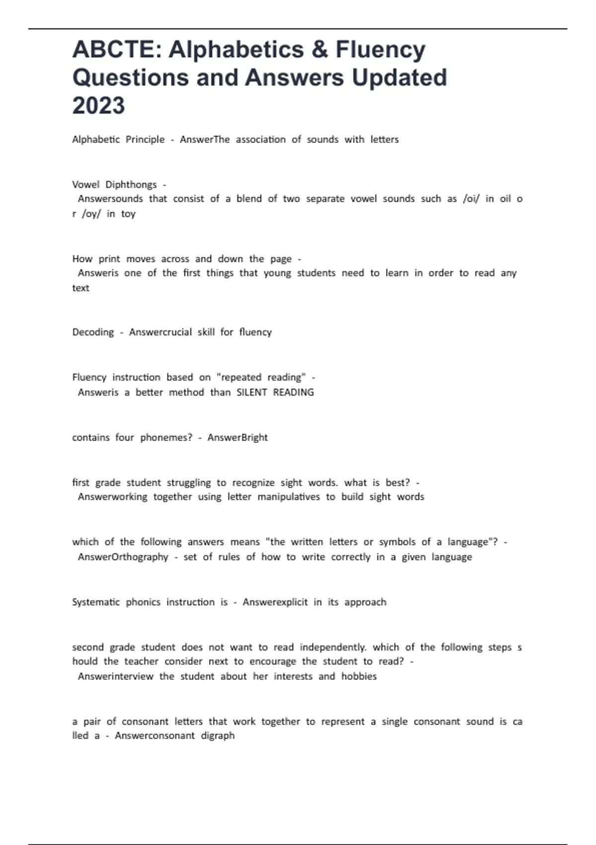 ABCTE: Alphabetics & Fluency Questions and Answers Updated 2023