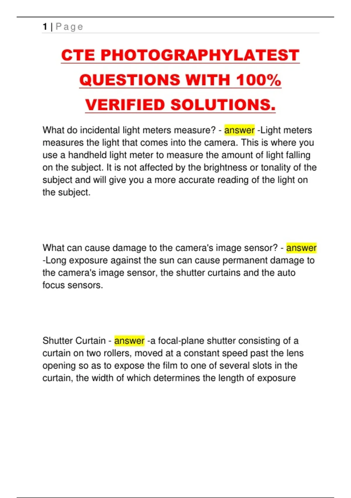 CTE PHOTOGRAPHYLATEST QUESTIONS WITH 100% VERIFIED SOLUTIONS.