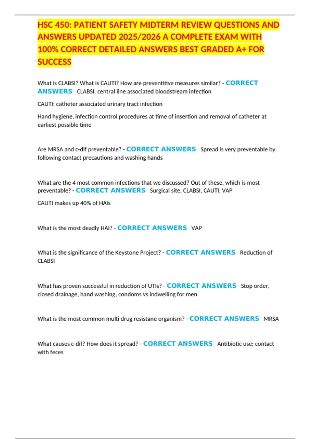 HSC 450: PATIENT SAFETY MIDTERM REVIEW QUESTIONS AND ANSWERS UPDATED 2025/2026 A COMPLETE EXAM WITH 100% CORRECT DETAILED ANSWERS BEST GRADED A+ FOR SUCCESS