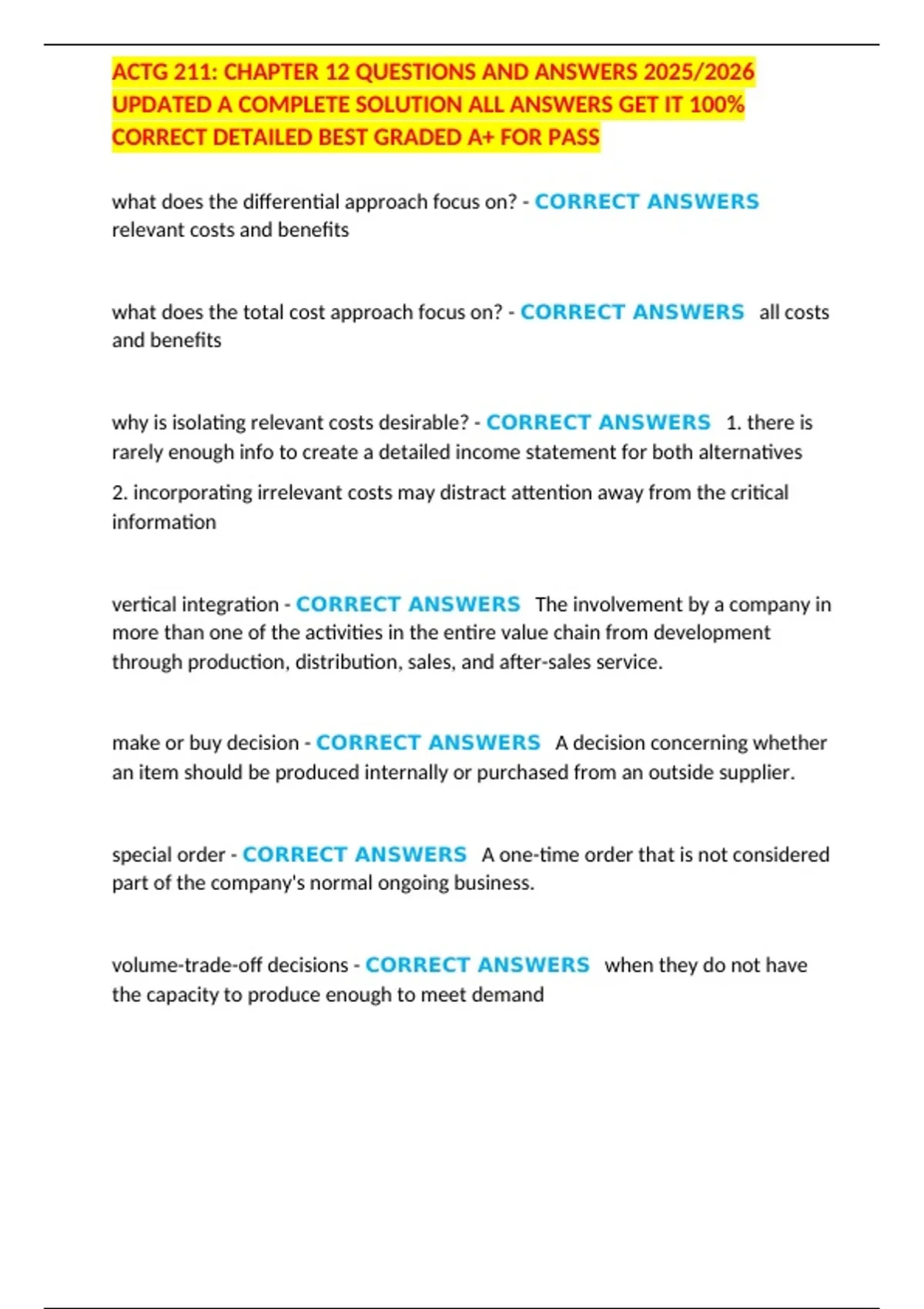 make or buy decision - CORRECT ANSWERS A decision concerning whether