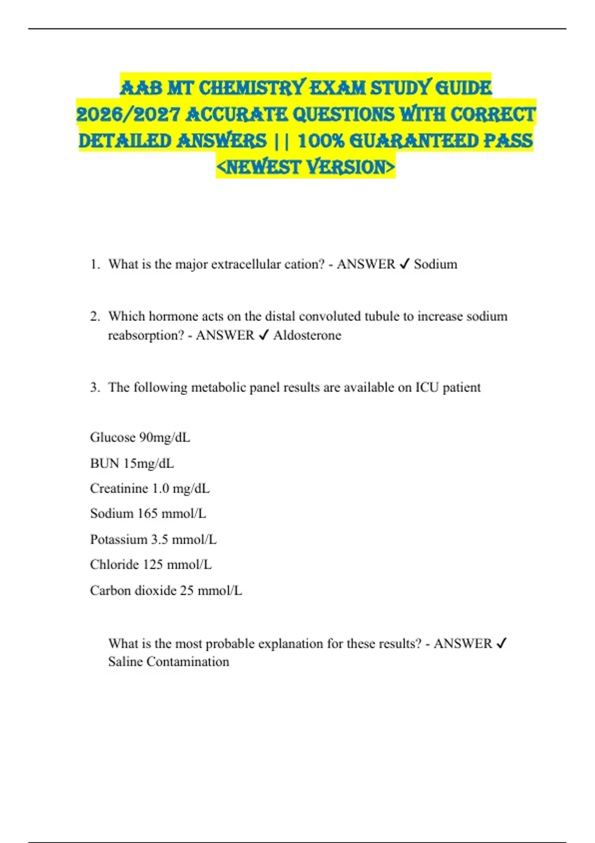 AAB MT Chemistry EXAM STUDY GUIDE 2026/2027 ACCURATE QUESTIONS WITH CORRECT DETAILED ANSWERS || 100% GUARANTEED PASS &lt;NEWEST VERSION&gt; 1. What is the major extracellular cation? - ANSWER Sodium 2. Which hormone acts on the distal convoluted tubule to increase sodium reabsorption? - ANSWER Aldosterone 3. The following metabolic panel results are available on ICU patient Glucose 90mg/dL BUN 15mg/dL Creatinine 1.0 mg/dL Sodium 165 mmol/L Potassium 3.5 mmol/L Chloride 125 mmol/L Carbon dioxide 25 mmol/L What is the most probable explanation for these results? - ANSWER Saline Contamination 4. What is the most common method for measuring sodium? - ANSWER ion-selective electrode 5. Which one of the following is the major intracellular cation? - ANSWER Potassium 6. A potassium result of 6.8 mmol/L obtained from a dialysis patient. Before reporting this result, what is the most appropriate action? - ANSWER Check for hemolysis 7. Valinomycin can enhance the selectivity of which ISE electrode? - ANSWER Potassium 8. Which of these potassium values would be termed hypokalemia? - ANSWER 3.0 mmol/L 9. All of the following can cause low chloride levels EXCEPT which one? - ANSWER Dehydration 10. Sweat is an appropriate type of specimen for which electrolyte? - ANSWER Chloride 11. In the coulometric-amperometric method for chloride, how is the amount of chloride measured? - ANSWER time needed to reach the titration end point 12. In the classic Schales-Schales (mercurimetric titration) method for chloride, what substance reacts with the indicator to form a violet color? - ANSWER excess Hg++ 13. Most of the carbon dioxide in the blood is present in which form? - ANSWER bicarbonate ion 14. All of the following specimens can be analyzed for carbon dioxide EXCEPT which one? - ANSWER Urine 15. Electrolytes normal ranges - ANSWER Sodium= 136-145 mmol/L Potassium Serum= 3.4-5.0 mmol/L Potassium Urine= 25-125 mmol/L Chloride Serum= 98-107 mmol/L Chloride Urine= 110-250 mmol/L Carbon dioxide= 22-29 mmol/L 16. In the complexometric titration (EDTA) method for calcium, the pH must be adjusted to prevent what occurrence? - ANSWER Interference by magnesium. 17. The classic clark-collip method for calcium is based on which assumption? - ANSWER Calcium will be precipitated as an oxalate. 18. What is the purpose of lanthanum in the atomic absorption determination of calcium? - ANSWER It will bind phosphate 19. at a pH of 7.4, most of the phosphorus in the body is in which form? - ANSWER bone 20. Inorganic phosphate can be determined from a colorimetric method involving which reagent? - ANSWER molybdate. 21. A labor and delivery patient with preeclampsia is being treated for premature contractions. Which one of the following is the most likely laboratory finding? - ANSWER Hypermagnesemia 22. The colorimetric method for magnesium employs which reagent? - ANSWER Titan yellow 23. When performing spectrophotometer quality checks, what is the holmium oxide glass filter used to assess? A. linearity B. stray light C. absorbance accuracy D. wavelength accuracy - ANSWER D. Wavelength accuracy 24. What is the principle of flame photometry? A. emission of a color when an element is burned B. absorption of energy when an atom is ionized C. electrometric titration D. colorimetric analysis - ANSWER A. Emission of a color when an element is burned