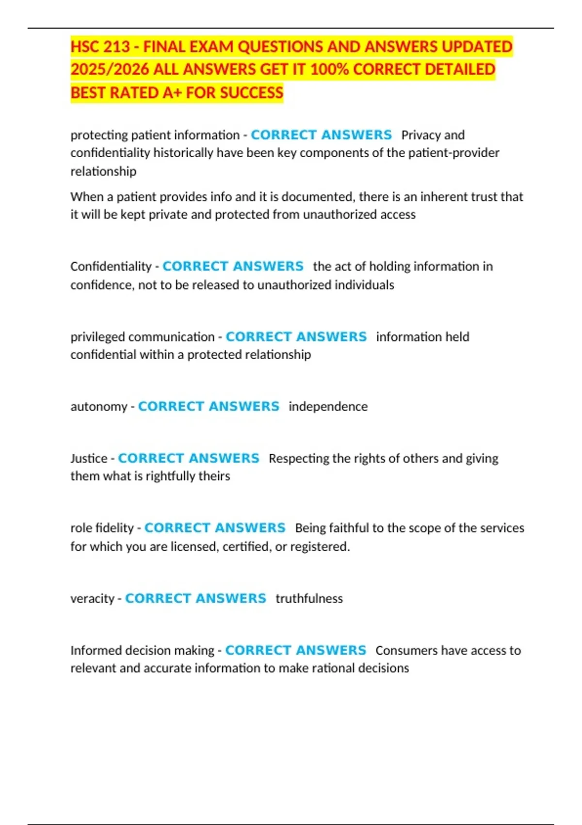 HSC 213 - FINAL EXAM QUESTIONS AND ANSWERS UPDATED