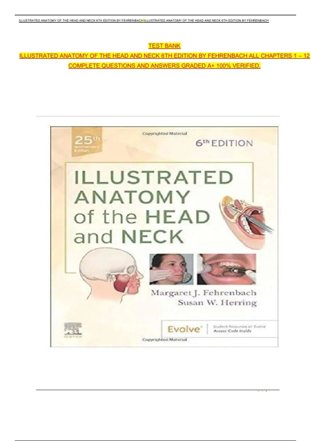 ILLUSTRATED ANATOMY OF THE HEAD AND NECK 6TH EDITION BY FEHRENBACH ALL CHAPTERS 1 – 12