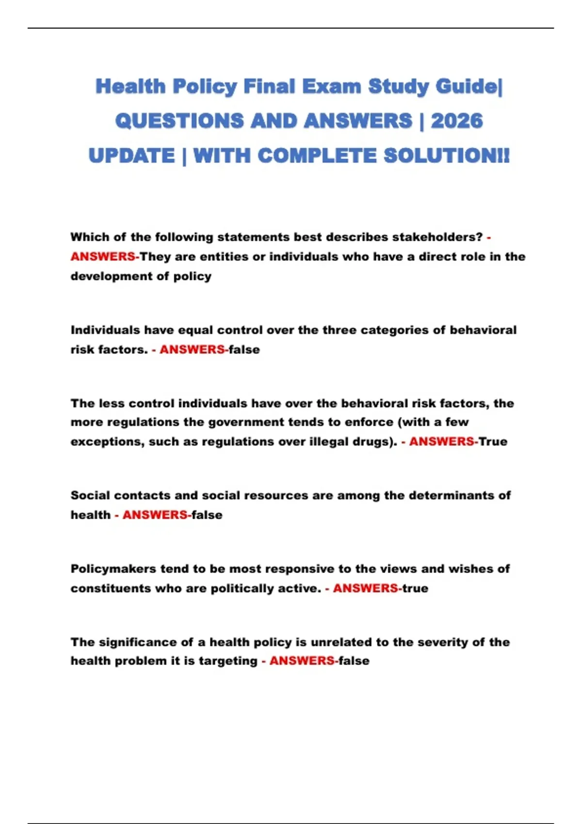 Health Policy Final Exam Study Guide| QUESTIONS AND ANSWERS | 2026 UPDATE | WITH COMPLETE SOLUTION!!