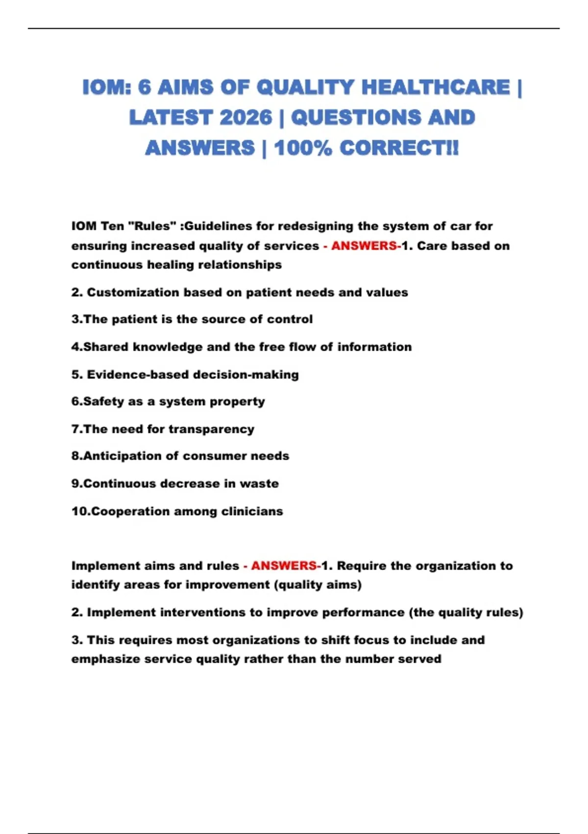 IOM: 6 AIMS OF QUALITY HEALTHCARE | LATEST 2026 | QUESTIONS AND ANSWERS | 100% CORRECT!!