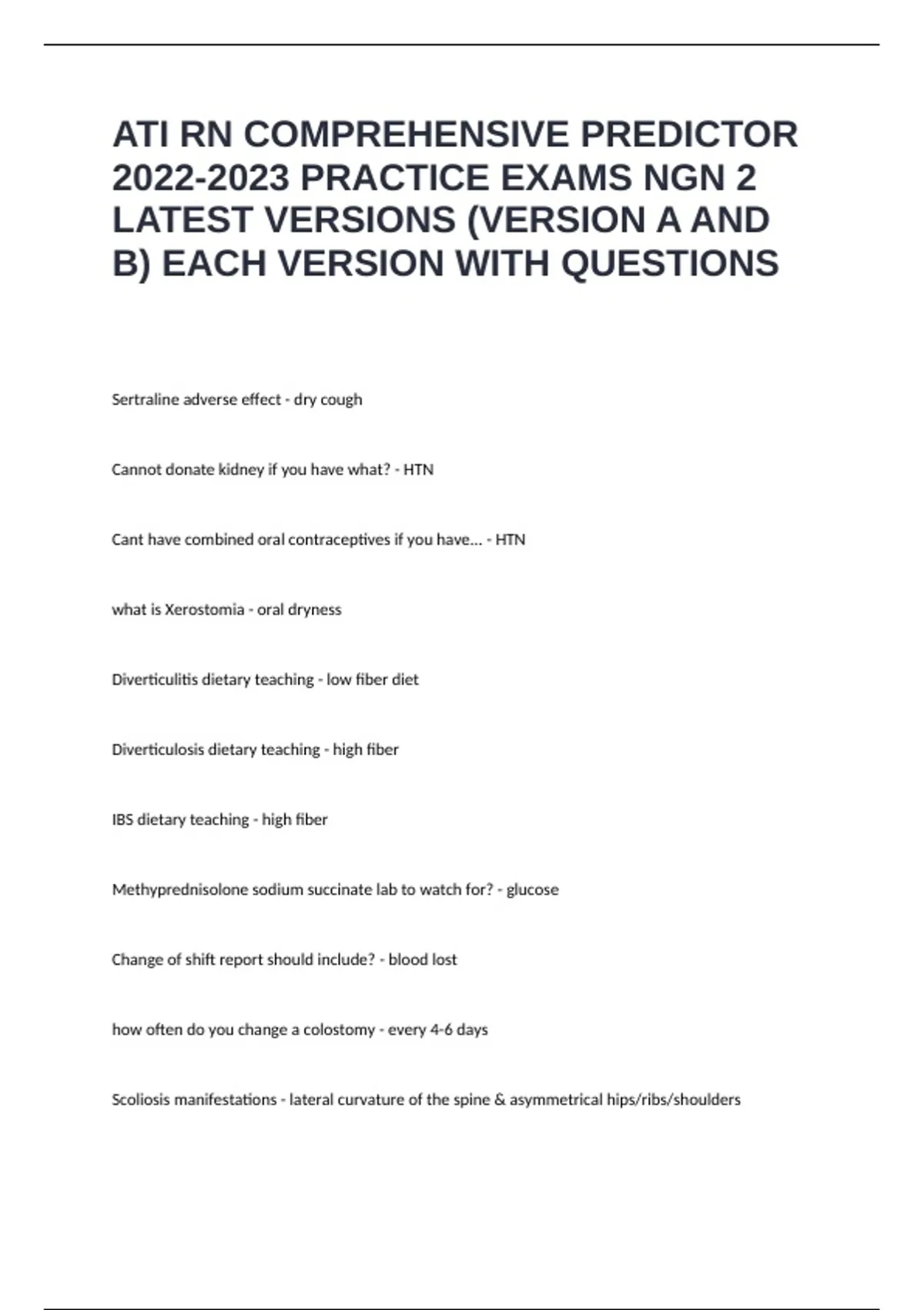ATI RN COMPREHENSIVE PREDICTOR PRACTICE EXAMS NGN 2 LATEST VERSIONS (VERSION A AND B) EACH VERSION WITH QUESTIONS