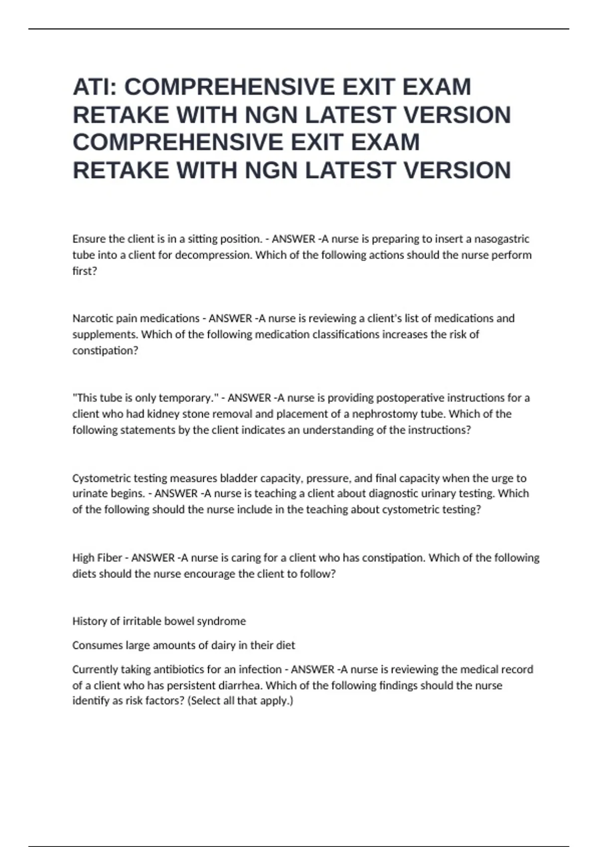 ATI: COMPREHENSIVE EXIT EXAM RETAKE WITH NGN LATEST VERSION COMPREHENSIVE EXIT EXAM RETAKE WITH NGN LATEST VERSION