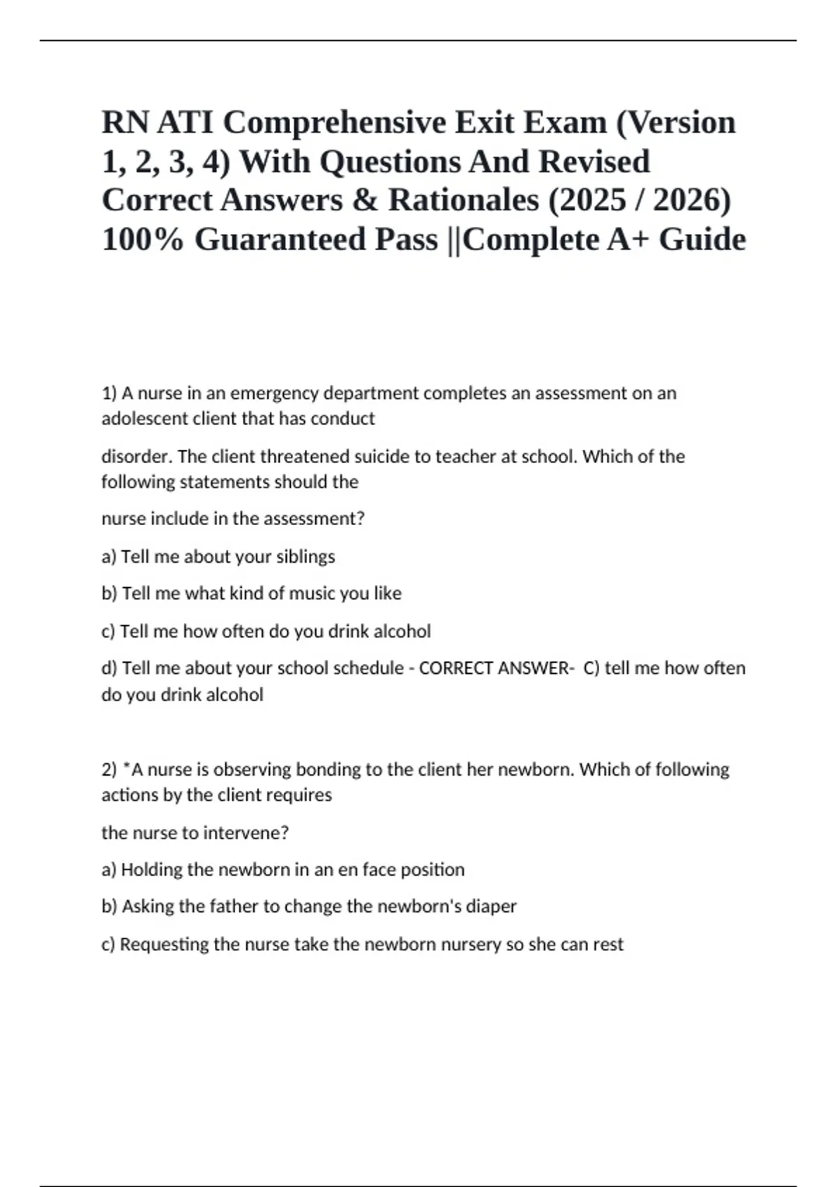 1) A nurse in an emergency department completes an assessment on an adolescent client that has conduct disorder. The client threatened suicide to teacher at school. Which of the following statements should the nurse include in the assessment? a) Tell me about your siblings b) Tell me what kind of music you like c) Tell me how often do you drink alcohol d) Tell me about your school schedule - CORRECT ANSWER- C) tell me how often do you drink alcohol 2) *A nurse is observing bonding to the client her newborn. Which of following actions by the client requires the nurse to intervene? a) Holding the newborn in an en face position b) Asking the father to change the newborn's diaper c) Requesting the nurse take the newborn nursery so she can rest d) Viewing the newborn's actions to be uncooperative - CORRECT ANSWER- d) Viewing the newborn's actions to be uncooperative 3) A nurse is caring for client who is taking levothyroxin. Which of the following findings should indicate that the medication is effective? a) Weight loss (this drug acts as T4 and will normalize the effects of hypothyroidism) b) Decreased blood pressure c) Absence of seizures d) Decrease inflammation - CORRECT ANSWER- a) Weight loss (this drug acts as T4 and will normalize the effects of hypothyroidism) 4) A nurse is planning discharge teaching for cord care for the parent of a newborn. Which instructions would you include in the teaching? a) Contact provider if the cord still turns black (it's going to turn black) b) Clean the base of the cord with hydrogen peroxide daily (clean with neutral pH cleanser) c) Keep the cord dry until it falls off (cord should be kept clean and dry to prevent infection) d) The cord stump will fall off in five days (cord falls off in 10-14 days) - CORRECT ANSWER- c) Keep the cord dry until it falls off (cord should be kept clean and dry to prevent infection)