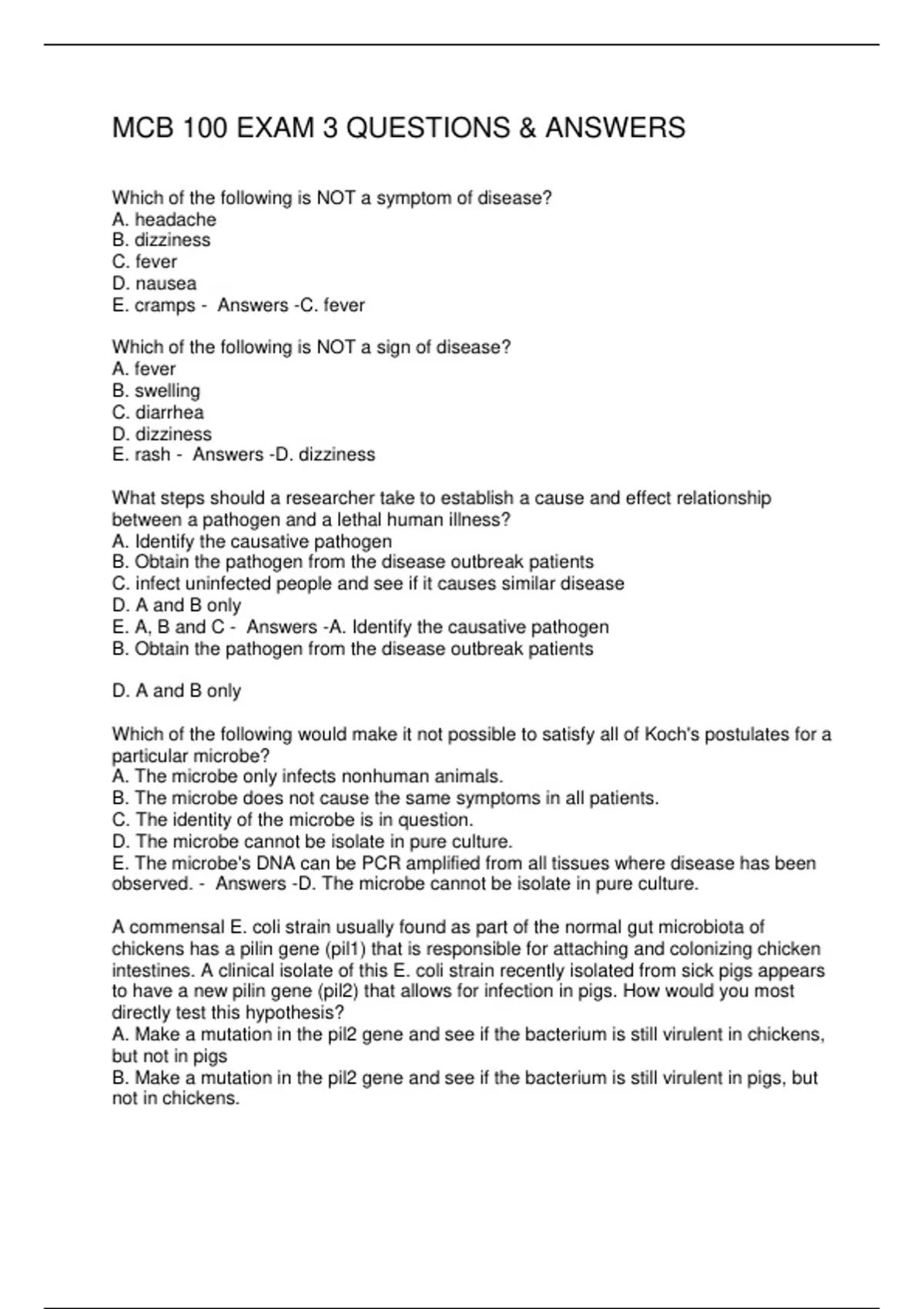 MCB 100 EXAM 3 QUESTIONS & ANSWERS