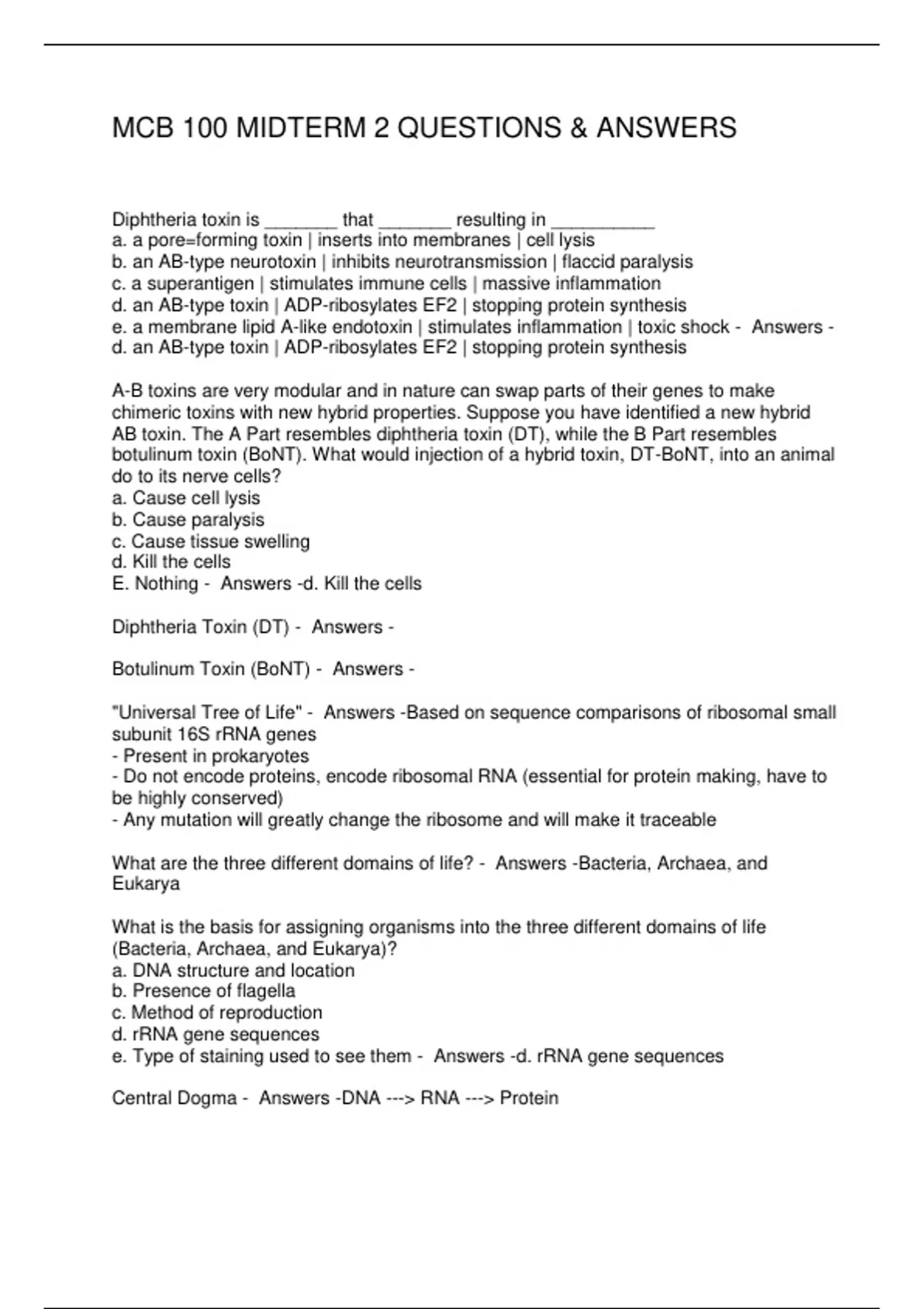 MCB 100 MIDTERM 2 QUESTIONS & ANSWERS