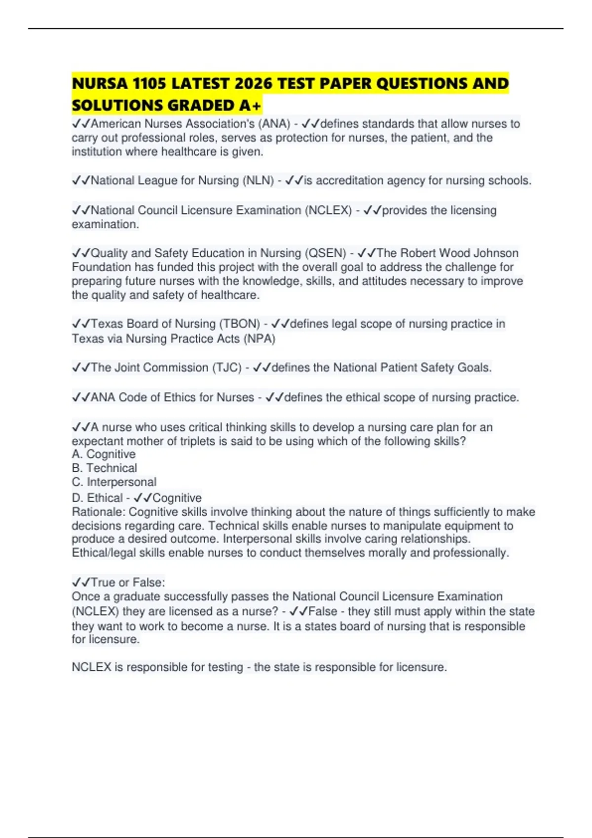 ✔✔National Council Licensure Examination (NCLEX) - ✔✔provides the licensing