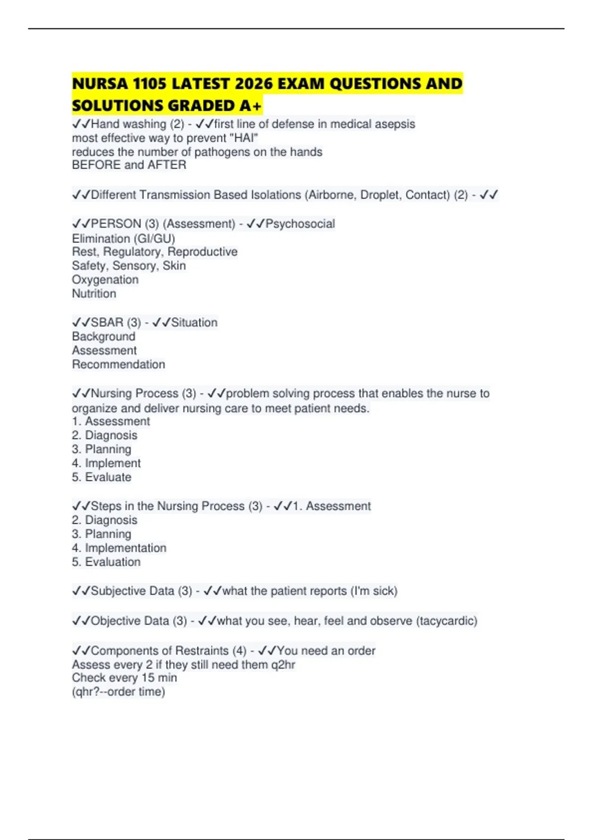 NURSA 1105 LATEST 2026 EXAM QUESTIONS AND SOLUTIONS GRADED A+