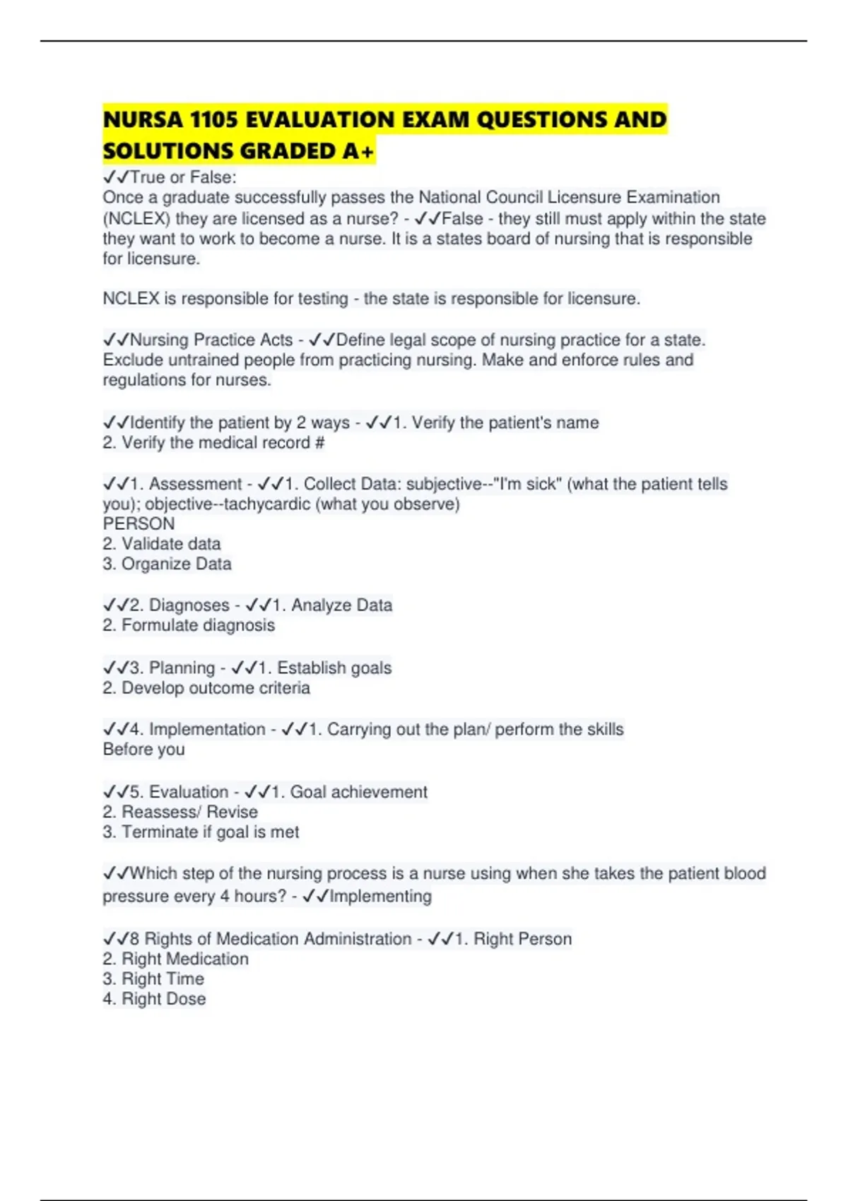 NURSA 1105 EVALUATION EXAM QUESTIONS AND SOLUTIONS GRADED A+