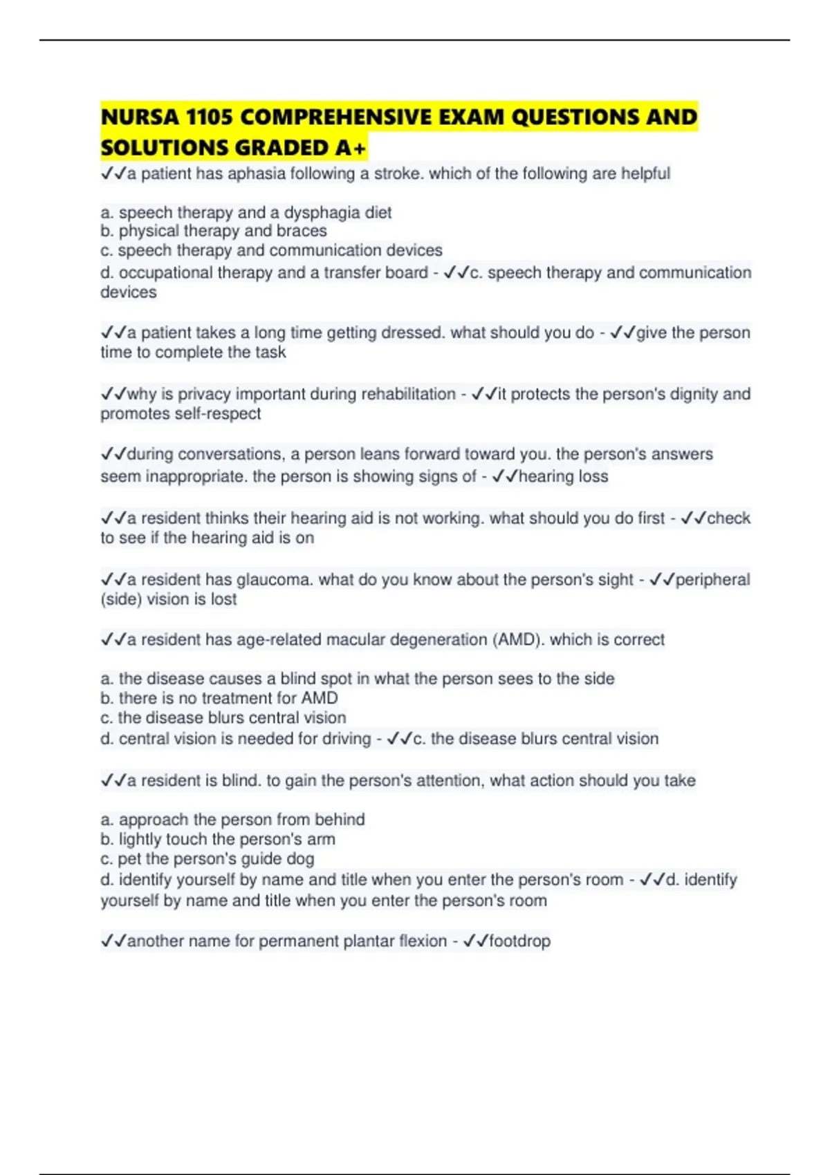 NURSA 1105 COMPREHENSIVE EXAM QUESTIONS AND SOLUTIONS GRADED A+