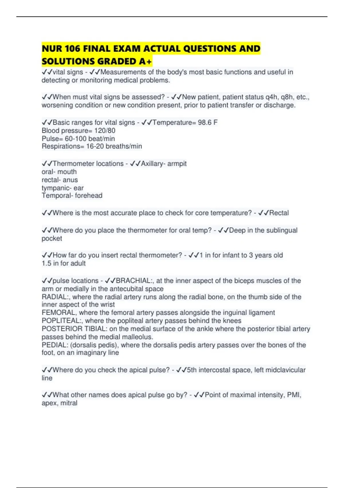 NUR 106 FINAL EXAM ACTUAL QUESTIONS AND SOLUTIONS GRADED A+
