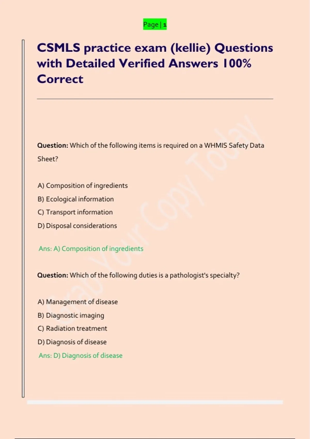 CSMLS practice exam (kellie) Questions with Detailed Verified Answers 100% Correct Question: Which of the following items is required on a WHMIS Safety Data Sheet? A) Composition of ingredients B) Ecological information C) Transport information D) Disposal considerations Ans: A) Composition of ingredients Question: Which of the following duties is a pathologist's specialty? A) Management of disease B) Diagnostic imaging C) Radiation treatment D) Diagnosis of disease Ans: D) Diagnosis of disease Page | 2 Question: What is the angle between the detector and the light path in turbidimetry? A) 0 B) 15 C) 30 D) 90 Ans: A) 0 Question: Which of the following red blood cell morphologies correlates with the given values below? MCV 70 fL; MCH 20 pg; MCHC 290 g L A) Normocytic normochromic B) Macrocytic hypochromic C) Macrocytic normochromic D) Microcytic hypochromic Ans: D) Microcytic hypochromic Question: Which of the following conditions best correlate with an anion gap of 12 mmol/L? A) Hypercalcemia B) Methanol poisoning