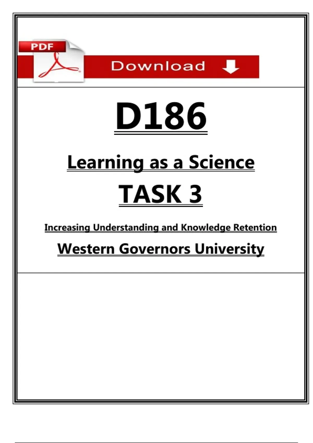 Instant PDF download for WGU D186 Learning as a Science Task 3: Increasing Understanding and Knowledge Retention. Rubric-aligned “passed” guide with a simple outline, required elements explained, research-based strategies (retrieval practice, spacing, interleaving, elaboration), sample wording you can adapt, and a final checklist to help you submit confidently in the 2026 term. WGU D186 Task 3, D186 Task 3 passed, Learning as a Science Task 3, Increasing understanding WGU, knowledge retention strategies, D186 Task 3 template, D186 Task 3 rubric, WGU performance assessment D186, WGU D186 guide PDF, D186 Task 3 checklist, retrieval practice classroom, spaced repetition learning, interleaving examples, elaboration strategies, formative assessment strategies, student understanding strategies, evidence based teaching, WGU Task 3 help, D186 task support, D186 Task 3 PDF, WGU D186 assignment guide