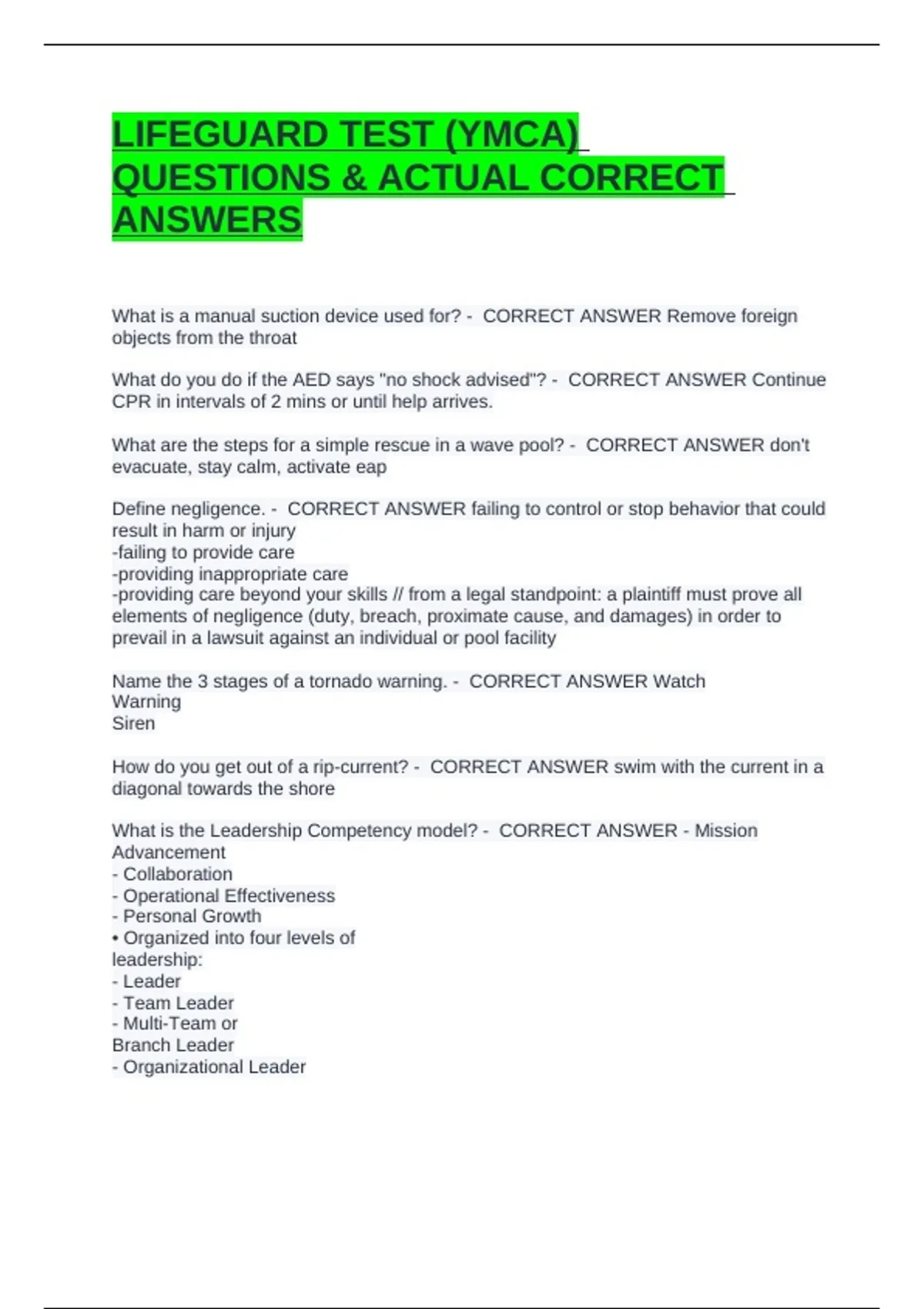 LIFEGUARD TEST (YMCA) QUESTIONS & ACTUAL CORRECT ANSWERS is a comprehensive training program that prepares individuals to prevent, recognize, and respond to aquatic emergencies. It combines physical skills, safety knowledge, and emergency medical training to ensure lifeguards can protect swimmers in pools, beaches, waterparks, and other aquatic environments.
