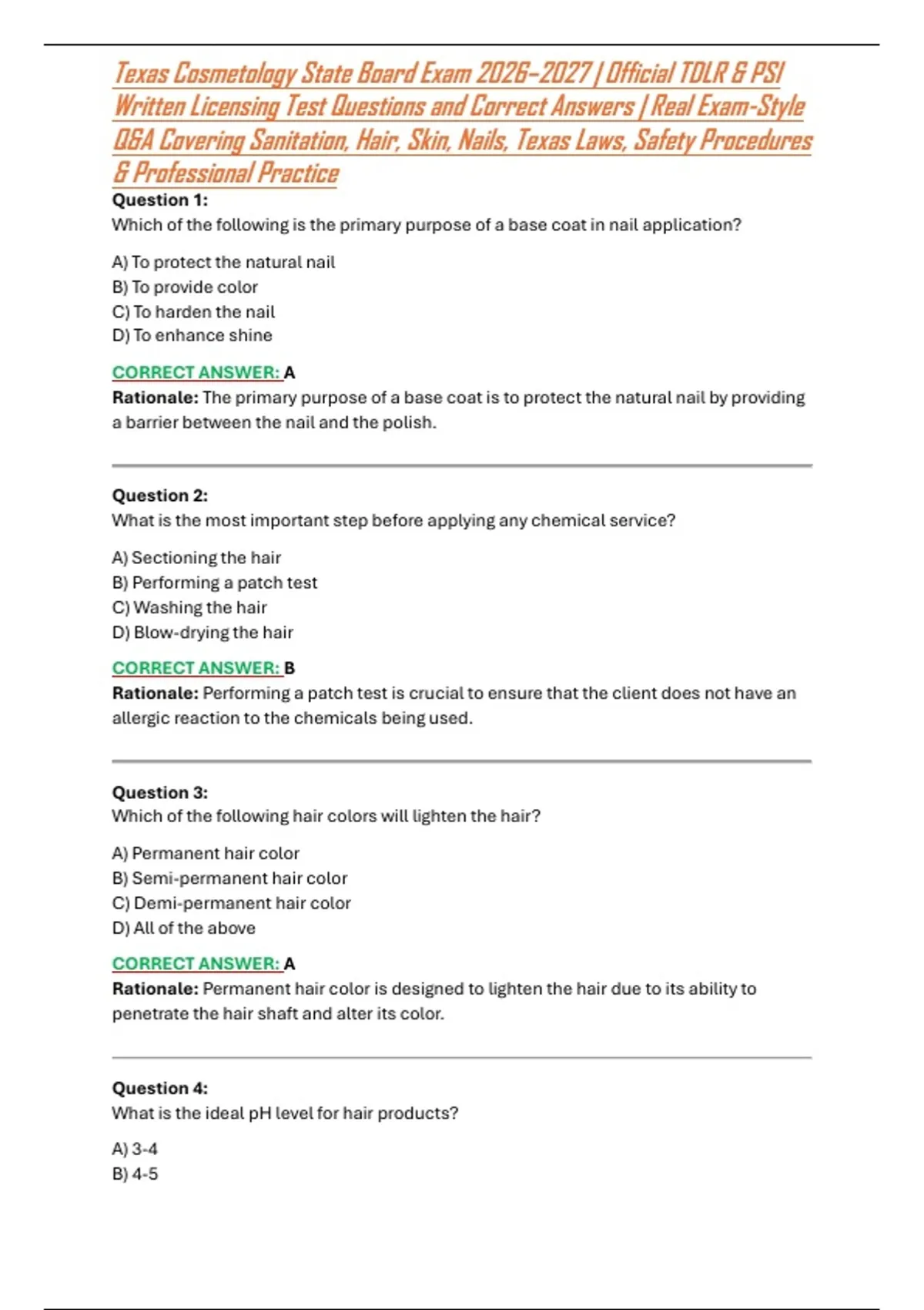 This Texas Cosmetology State Board Exam 2026 study guide is fully aligned with the Texas Department of Licensing and Regulation (TDLR) and PSI written licensing exam, providing real exam-style questions with verified correct answers to help cosmetology candidates pass on the first attempt. Carefully structured to reflect the actual exam format, this resource covers all tested domains including sanitation and infection control, hair care, skin care, nail technology, Texas cosmetology laws and rules, safety procedures, and professional practices. Designed for fast revision, confidence building, and exam accuracy, this downloadable document saves hours of study time while increasing pass readiness, making it ideal for first-time test takers, repeat candidates, and last-minute reviewers preparing for the 2026 Texas Cosmetology written exam.