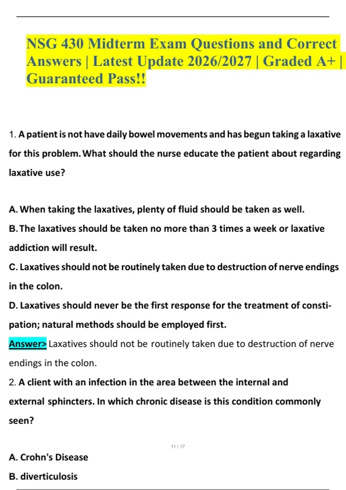 1. A patient is not have daily bowel movements and has begun taking a laxative