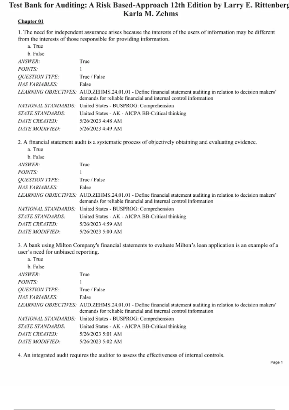 Complete Test Bank — Auditing: A Risk-Based Approach, 12th Edition by Karla Johnstone-Zehms (Chapters 1–21)