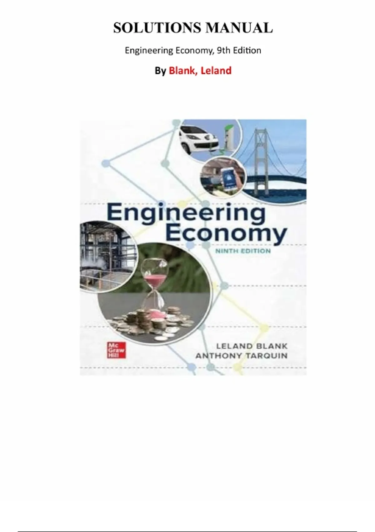 This document provides the complete solutions manual for Engineering Economy, 9th Edition by Leland Blank and Anthony Tarquin, covering chapters 1 through 19. It includes detailed, step-by-step solutions, calculations, and explanations for all end-of-chapter problems, fully aligned with the 9th edition. 1) Foundations of Engineering Economy, 2) Factors: How Time and Interest Affect Money, 3) Combining Factors and Spreadsheet Functions, 4) Nominal and Effective Interest Rates Learning Stage 2 - Basic Analysis Tools, 5) Analysis Using Present Worth and Future Worth Values, 6) Annual Worth Analysis, 7) Rate of Return Analysis: One Project, 8) Rate of Return Analysis: Multiple Alternatives, 9) Benefit/Cost Analysis and Public Sector Economics Learning Stage 2 - Epilogue: Selecting the Basic Analysis Tool Learning Stage 3 - Making Decisions, 10) Project Financing and Noneconomic Attributes, 11) Replacement and Retention Decisions, 12) Independent Projects with Budget Limitation, 13) Breakeven and Payback Analysis Learning Stage 4 - Rounding Out the Study, 14) Effects of Inflation, 15) Cost Estimation and Indirect Cost Allocation, 16) Depreciation and Depletion Methods, 17) After-Tax Economic Analysis, 18) Sensitivity Analysis and Staged Decisions, 19) Decision Making under Risk