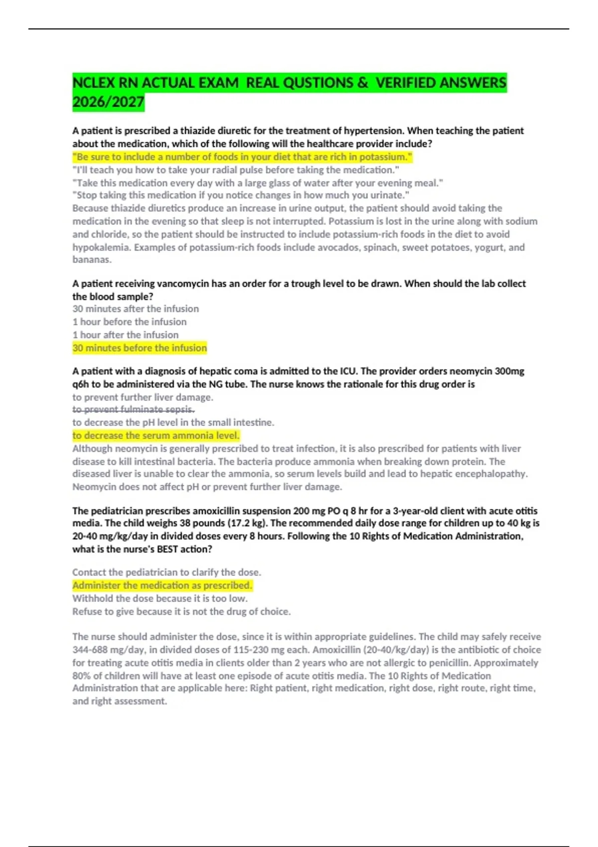 NCLEX RN ACTUAL EXAM REAL QUSTIONS & VERIFIED ANSWERS 2026/2027