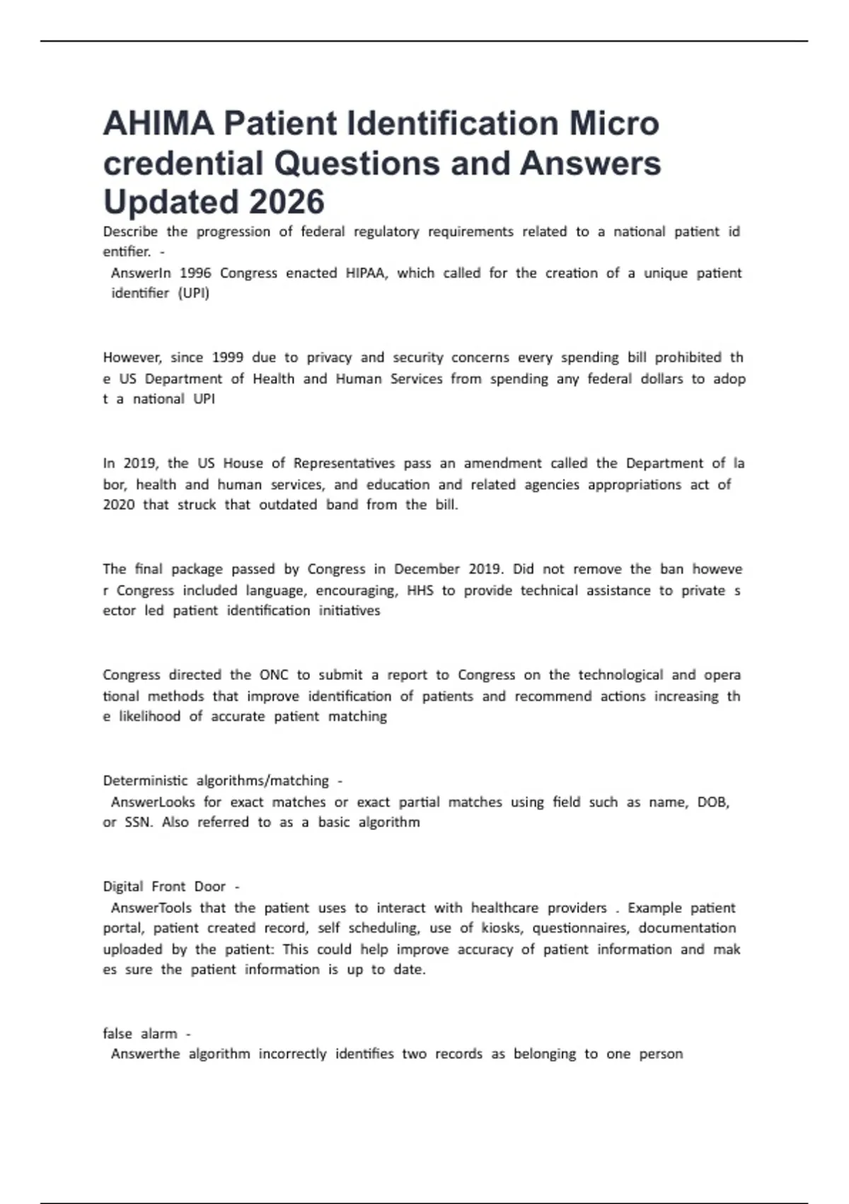 AHIMA Patient Identification Micro credential Questions and Answers Updated 2026