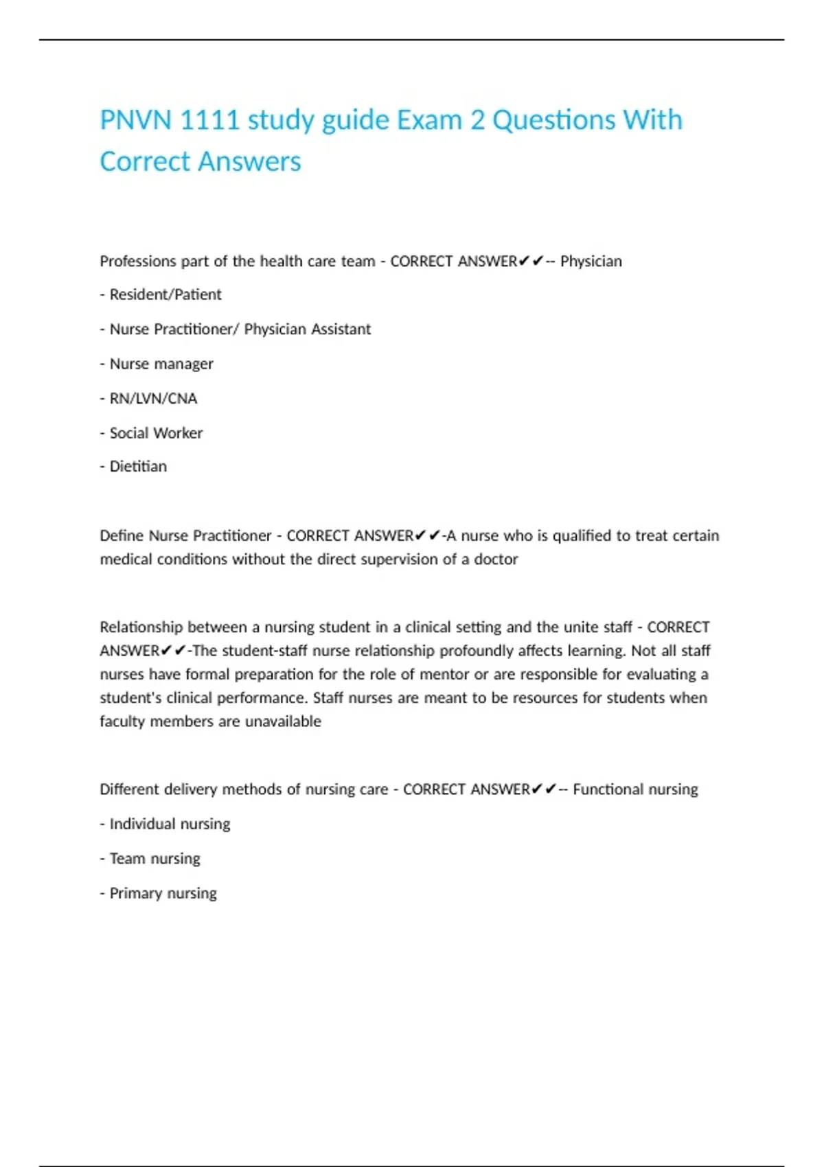 Different |delivery |methods |of |nursing |care |- |CORRECT |ANSWER✔✔-- |Functional |nursing