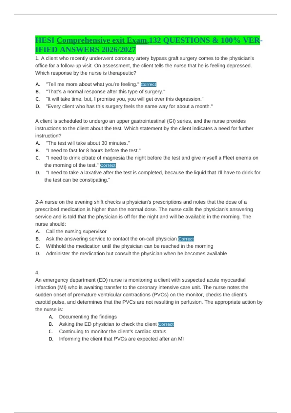HESI Comprehensive exit Exam,132 QUESTIONS & 100% VERIFIED ANSWERS 2026/2027 HESI Comprehensive exit Exam,132 QUESTIONS & 100% VERIFIED ANSWERS 2026/2027 HESI Comprehensive exit Exam,132 QUESTIONS & 100% VERIFIED ANSWERS 2026/2027