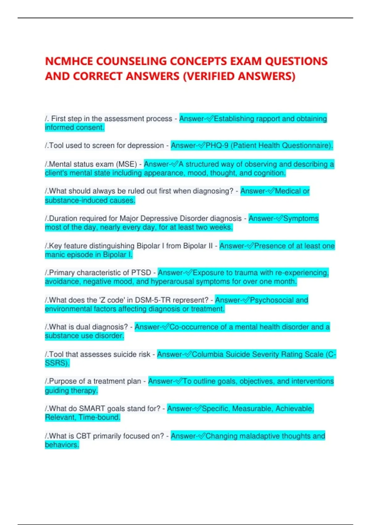 NCMHCE COUNSELING CONCEPTS EXAM QUESTIONS AND CORRECT ANSWERS (VERIFIED ANSWERS) /. First step in the assessment process - Answer-Establishing rapport and obtaining informed consent. /.Tool used to screen for depression - Answer-PHQ-9 (Patient Health Questionnaire). /.Mental status exam (MSE) - Answer-A structured way of observing and describing a client's mental state including appearance, mood, thought, and cognition. /.What should always be ruled out first when diagnosing? - Answer-Medical or substance-induced causes. /.Duration required for Major Depressive Disorder diagnosis - Answer-Symptoms most of the day, nearly every day, for at least two weeks. /.Key feature distinguishing Bipolar I from Bipolar II - Answer-Presence of at least one manic episode in Bipolar I. /.Primary characteristic of PTSD - Answer-Exposure to trauma with re-experiencing, avoidance, negative mood, and hyperarousal symptoms for over one month. /.What does the 'Z code' in DSM-5-TR represent? - Answer-Psychosocial and environmental factors affecting diagnosis or treatment. /.What is dual diagnosis? - Answer-Co-occurrence of a mental health disorder and a substance use disorder. /.Tool that assesses suicide risk - Answer-Columbia Suicide Severity Rating Scale (C-SSRS). /.Purpose of a treatment plan - Answer-To outline goals, objectives, and interventions guiding therapy. /.What do SMART goals stand for? - Answer-Specific, Measurable, Achievable, Relevant, Time-bound. /.What is CBT primarily focused on? - Answer-Changing maladaptive thoughts and behaviors. /.Key concept in Person-Centered Therapy - Answer-Unconditional positive regard. /.What does OARS stand for in Motivational Interviewing? - Answer-Open-ended questions, Affirmations, Reflective listening, Summarizing. /.Main focus of DBT - Answer-Emotion regulation, distress tolerance, mindfulness, and interpersonal effectiveness. /.Define psychoeducation - Answer-Providing clients with information about their disorder and coping strategies. /.What is a safety plan? - Answer-A step-by-step plan for clients at risk of self-harm or suicide. /.What is case conceptualization? - Answer-Linking assessment data to a theoretical framework to guide treatment. /.What is relapse prevention? - Answer-Identifying triggers and strategies to maintain progress post-treatment. /.Primary ethical document for counselors - Answer-ACA Code of Ethics (2014). /.Define informed consent - Answer-Client's voluntary agreement after understanding risks, benefits, and limits of counseling. /.When must confidentiality be broken? - Answer-When there is risk of harm to self or others or by legal mandate. /.Define dual relationship - Answer-When a counselor has multiple roles with a client that could impair objectivity. /.What does FERPA protect? - Answer-Privacy of student education records. /.What is supervision in clinical practice? - Answer-Oversight by a qualified professional to ensure ethical and competent care. /.Define countertransference - Answer-Counselor's emotional reaction toward the client. /.What is burnout? - Answer-Emotional exhaustion and reduced efficacy due to chronic stress.