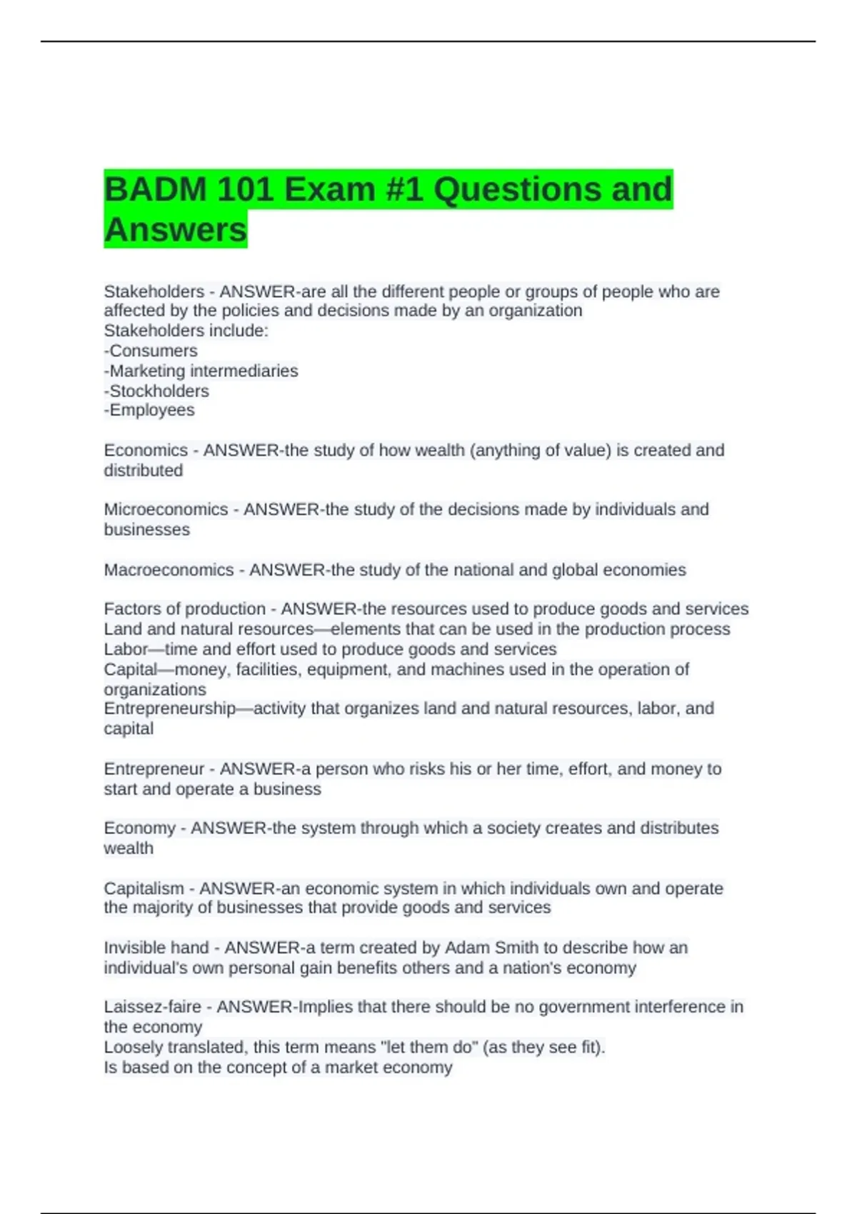 BADM 101 Exam #1 Questions and Answers