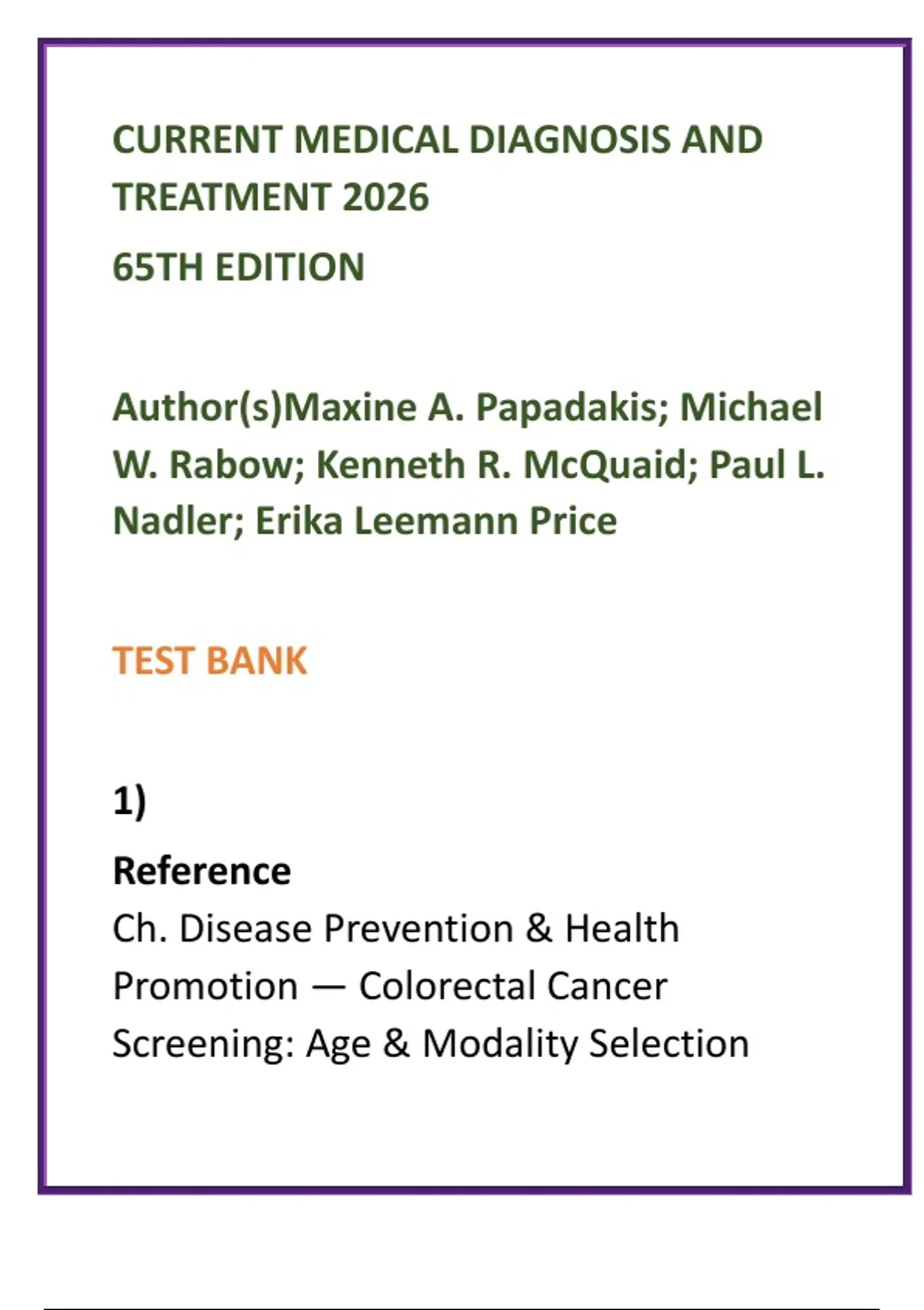 CURRENT Medical Diagnosis & Treatment 2026 Test Bank | CMDT 65th Ed | 20 MCQs per Chapter | USMLE-Style Clinical Medicine Questions 2️⃣ SEO Product Description (200–300 words) Master real-world clinical decision-making with this comprehensive CURRENT Medical Diagnosis & Treatment 2026 (65th Edition) Test Bank, meticulously designed for medical, PA, NP, and advanced nursing learners who rely on CMDT as their core reference. This premium digital question bank provides full textbook coverage across every chapter and body system, with 20 high-yield, exam-style MCQs per chapter. Each question is case-based, clinically authentic, and engineered to test physician-level reasoning, not rote memorization. Detailed, evidence-based rationales explain why an answer is correct and why alternatives are not—mirroring the thinking required on ward rounds, OSCEs, and high-stakes exams. Questions emphasize diagnosis, differential diagnosis, appropriate investigations, guideline-concordant management, prevention strategies, and complications, fully aligned with CURRENT Medical Diagnosis & Treatment 2026 recommendations. This makes the test bank ideal for learners seeking efficient, high-impact reinforcement of CMDT content while improving speed, accuracy, and clinical confidence. Ideal for: Internal Medicine & Family Medicine rotations Clinical Medicine & Primary Care courses Adult Health & Advanced Medical-Surgical curricula USMLE Step 2 CK & Step 3 preparation Physician Assistant (PA) and Nurse Practitioner (NP) medical management courses Key Features: Full CMDT 2026 chapter-by-chapter coverage 20 exam-quality MCQs per chapter Detailed, evidence-based clinical rationales USMLE-style, case-based clinical scenarios Designed to improve diagnostic accuracy and exam performance Built on **CMDT—the gold-standard, clinician-trusted reference in medicine—**this test bank is a powerful, time-saving tool for mastering modern clinical practice and excelling on exams. 3️⃣ 8 High-Value SEO Keywords CURRENT Medical Diagnosis and Treatment test bank CMDT 2026 MCQs clinical medicine question bank internal medicine exam questions USMLE Step 2 CK clinical questions family medicine MCQs medical diagnosis study guide PA NP medical management test bank 4️⃣ 10 Hashtags #CurrentMedicalDiagnosis #CMDT2026 #MedicalTestBank #ClinicalMedicineMCQs #InternalMedicinePrep #FamilyMedicineStudy #USMLEStep2CK #PAMedicine #NPMedicalEducation #MedicalExamPrep