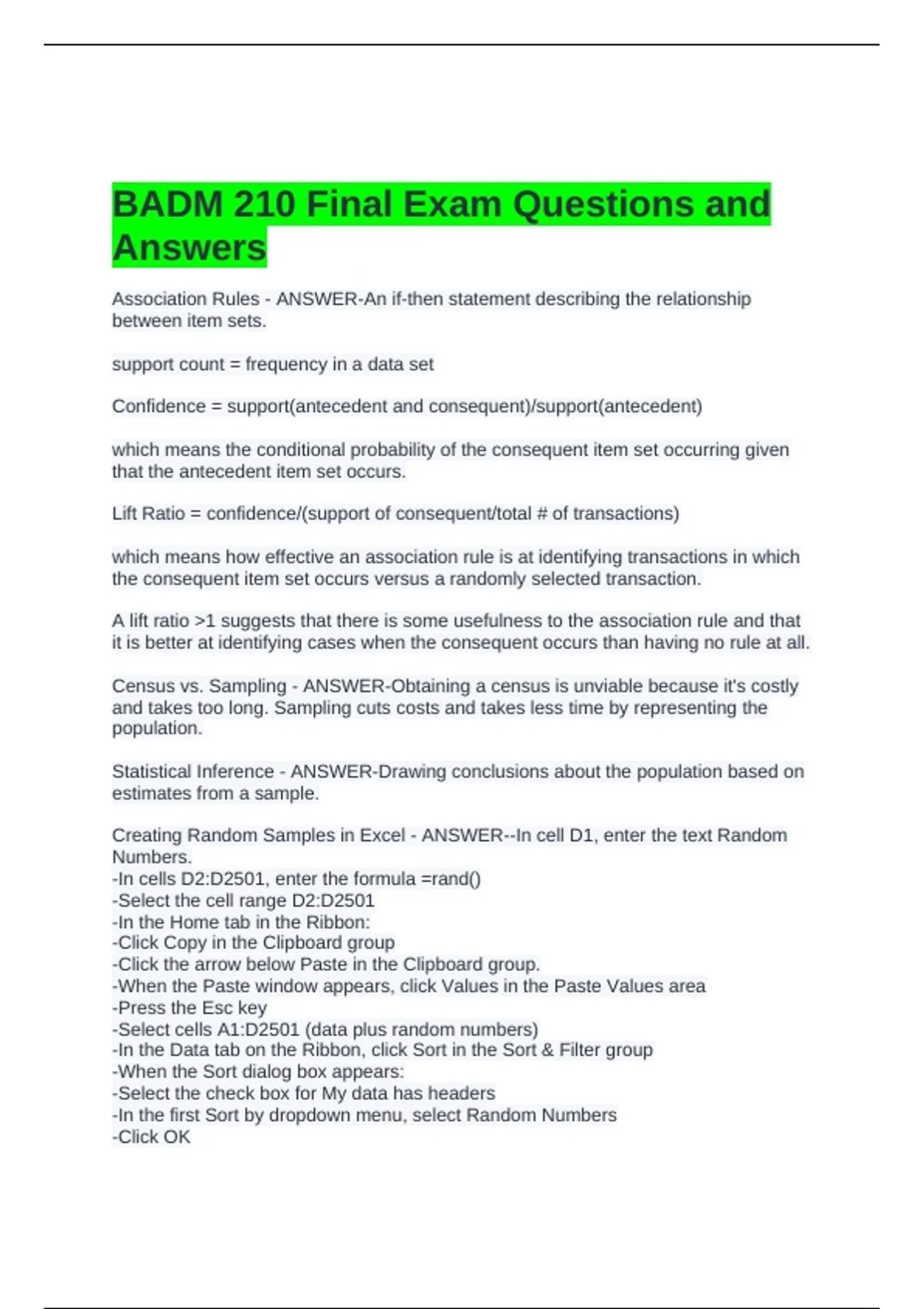 BADM 210 Final Exam Questions and