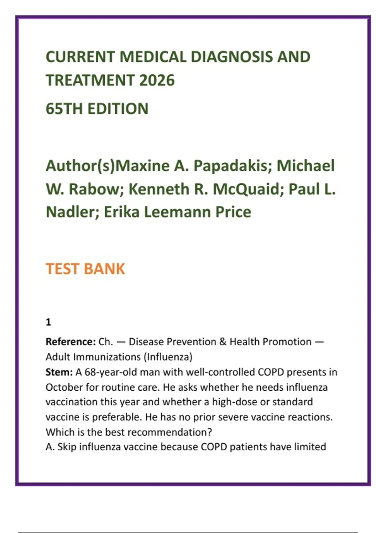 CURRENT Medical Diagnosis & Treatment 2026 Test Bank | CMDT 65th Ed | USMLE-Style Clinical Medicine MCQs 2️⃣ SEO Product Description (200–300 words) Master real-world clinical decision-making with this comprehensive CURRENT Medical Diagnosis & Treatment (CMDT) 2026 Test Bank, meticulously designed to reinforce physician-level diagnostic reasoning, evidence-based management, and exam readiness. Built directly from the 65th Edition of CURRENT Medical Diagnosis & Treatment, this digital test bank delivers full textbook coverage across all chapters, systems, and disease categories, with 20 high-yield, exam-style MCQs per chapter. Every question is case-based and clinically realistic, requiring interpretation of history, physical findings, investigations, and risk factors—mirroring the ambiguity of real patient care and modern licensing exams. Each MCQ includes verified correct answers with detailed, evidence-based rationales, explaining why a choice is correct and why alternatives are not, reinforcing differential diagnosis, diagnostic sequencing, and guideline-aligned management. Questions span outpatient, inpatient, and emergency settings and integrate pharmacologic and non-pharmacologic treatment decisions, complications, and red-flag recognition. This test bank is ideal for learners and clinicians using CURRENT Medical Diagnosis & Treatment as their core reference, including: Internal Medicine & Family Medicine rotations Clinical Medicine & Primary Care courses Adult Health & Advanced Medical-Surgical curricula USMLE Step 2 CK / Step 3 preparation Physician Assistant (PA) and Nurse Practitioner (NP) medical management courses CMDT is the gold-standard, clinician-trusted reference worldwide—and this test bank transforms it into an efficient, score-boosting active-learning tool. Key Features Full CMDT 2026 chapter-by-chapter coverage 20 clinically accurate MCQs per chapter USMLE-style, case-based clinical reasoning Detailed evidence-based rationales Ideal for exams, rotations, and clinical mastery 3️⃣ 8 High-Value SEO Keywords CURRENT Medical Diagnosis and Treatment test bank CMDT 2026 MCQs clinical medicine question bank internal medicine exam questions USMLE Step 2 CK clinical MCQs family medicine test bank medical diagnosis study guide PA NP clinical medicine questions 4️⃣ 10 SEO-Optimized Hashtags #CURRENTMedicalDiagnosis #CMDT2026 #ClinicalMedicine #InternalMedicine #USMLEPrep #MedicalTestBank #FamilyMedicine #PAStudent #NPStudent #MedicalEducation