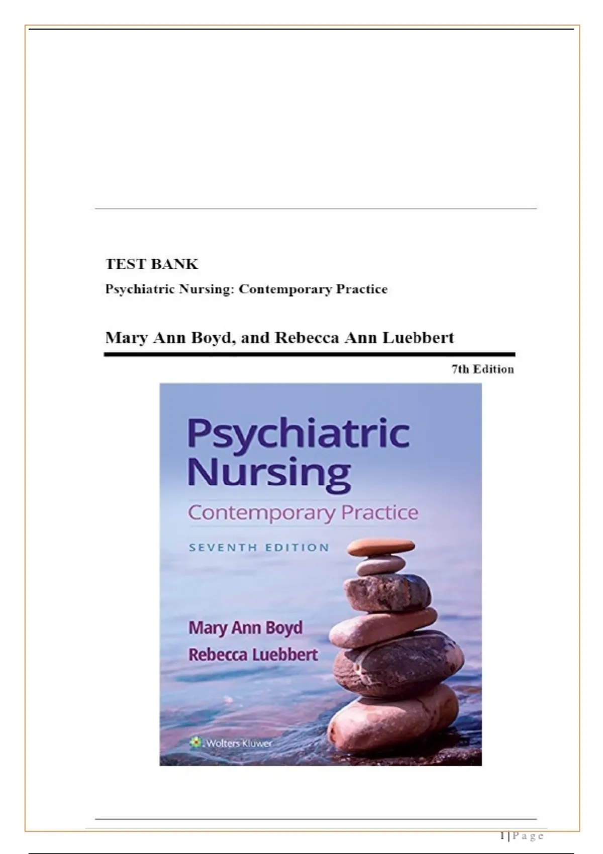 Boost your exam performance with this comprehensive Test Bank for Psychiatric Nursing: Contemporary Practice 7th Edition by Mary Ann Boyd & Rebecca Luebbert. Perfect for nursing students, instructors, and professionals, this resource includes hundreds of practice questions and verified answer keys across all 44 chapters. Covers essential topics such as psychiatric-mental health nursing foundations, DSM-IV-TR classifications, psychopharmacology, therapeutic communication, and mental health promotion across the lifespan. Designed to reinforce key concepts, enhance critical thinking, and prepare you for course exams, ATI, or NCLEX. All answers are included for self-assessment and efficient study