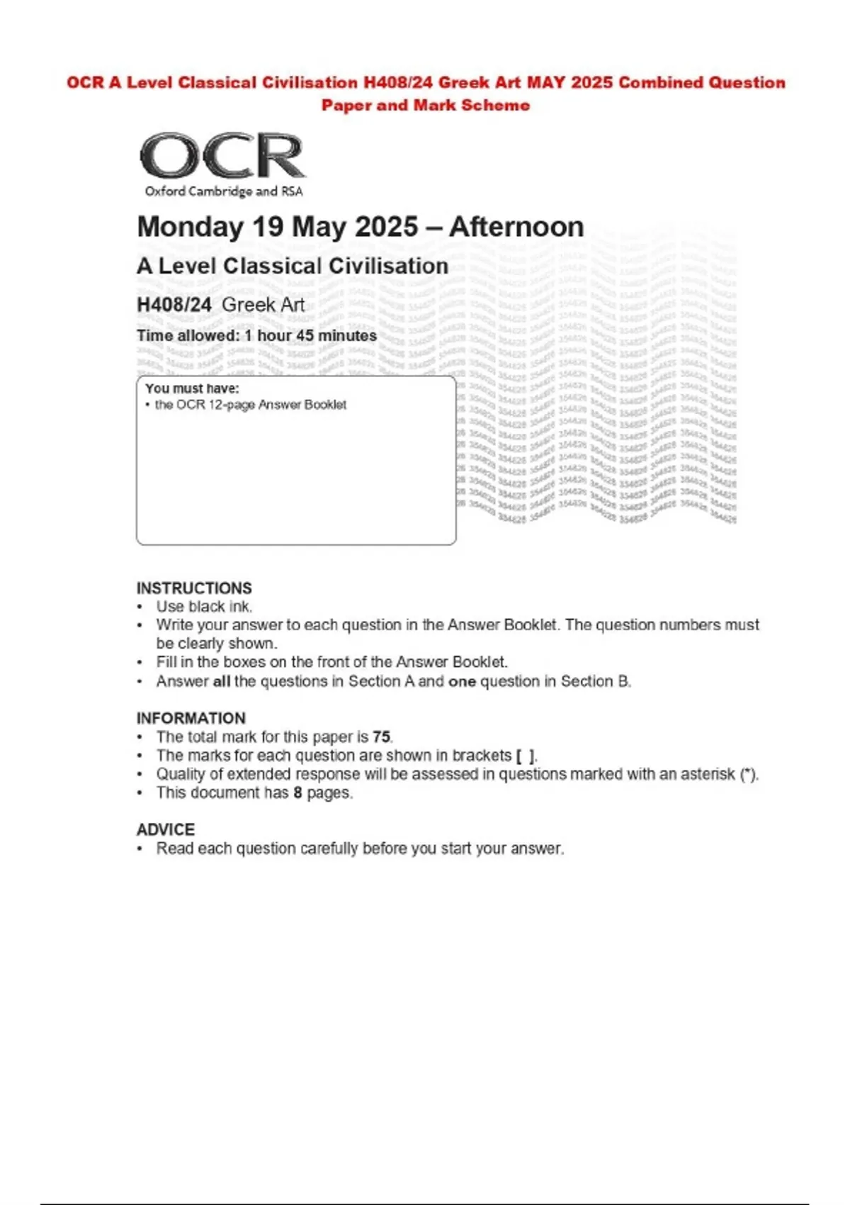 OCR A Level Classical Civilisation H408/24 Greek Art MAY 2025 Combined Question Paper and Mark Scheme