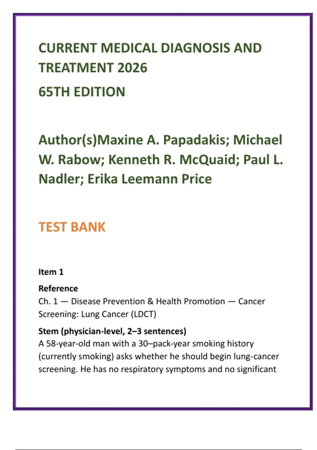 CURRENT Medical Diagnosis & Treatment 2026 Test Bank | CMDT 65th Ed MCQs | Clinical Medicine & Internal Medicine Exam Prep 2️⃣ SEO Product Description (200–300 words) Master real-world clinical decision-making with this CURRENT Medical Diagnosis & Treatment 2026 (65th Edition) Comprehensive Test Bank, meticulously designed for medical, PA, NP, and advanced nursing learners who rely on CMDT as their primary clinical reference. This digital test bank provides full textbook coverage across all chapters, systems, and sections, with 20 exam-style, physician-level MCQs per chapter. Each question is built around realistic outpatient and inpatient clinical scenarios, emphasizing diagnostic reasoning, differential diagnosis, appropriate investigations, evidence-based management, and complication recognition—the exact skills tested in modern medical and postgraduate exams. All questions include clearly identified correct answers with detailed, guideline-aligned rationales, reinforcing not just what is correct, but why it is correct and why alternatives are wrong. This approach accelerates pattern recognition, sharpens clinical judgment, and improves exam performance. CURRENT Medical Diagnosis & Treatment is a gold-standard, clinician-trusted reference used worldwide in undergraduate and postgraduate medical education. This test bank is purpose-built to mirror its structure, language, and clinical priorities—making it an ideal companion for learners preparing for high-stakes assessments and real patient care. Ideal for: Internal Medicine & Family Medicine courses Clinical Medicine & Primary Care rotations Adult Health & Advanced Medical-Surgical Nursing USMLE Step 2 CK & Step 3 preparation Physician Assistant (PA) and Nurse Practitioner (NP) medical management courses Key Features: FULL CMDT 2026 (65th Ed) chapter-by-chapter coverage 20 high-yield MCQs per chapter Case-based, USMLE-style clinical reasoning questions Evidence-based explanations aligned with standard-of-care guidelines Designed to save time, boost scores, and reinforce clinical competence 3️⃣ High-Value SEO Keywords (8) CURRENT Medical Diagnosis and Treatment test bank CMDT 2026 MCQs medical diagnosis MCQs clinical medicine question bank internal medicine exam questions USMLE-style clinical questions family medicine test bank PA NP medical management exam prep 4️⃣ Hashtags (10) #CurrentMedicalDiagnosis #CMDT2026 #MedicalTestBank #ClinicalMedicine #InternalMedicinePrep #USMLEStep2 #FamilyMedicine #PAMedicalEducation #NPStudent #MedicalExamPrep