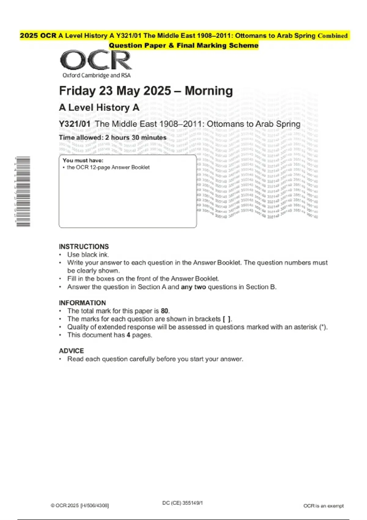 2025 OCR A Level History A Y321/01 The Middle East 1908–2011: Ottomans to Arab Spring Combined Question Paper and Marking Scheme
