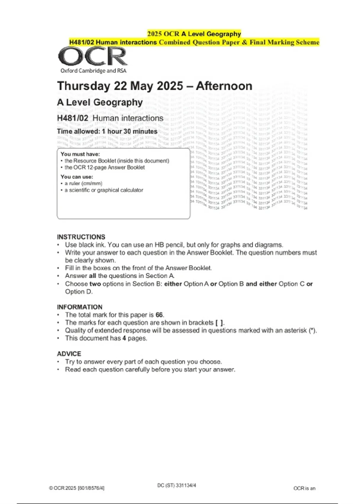 2025 OCR A Level Geography H481/02 Human interactions Combined Question Paper and Marking Scheme