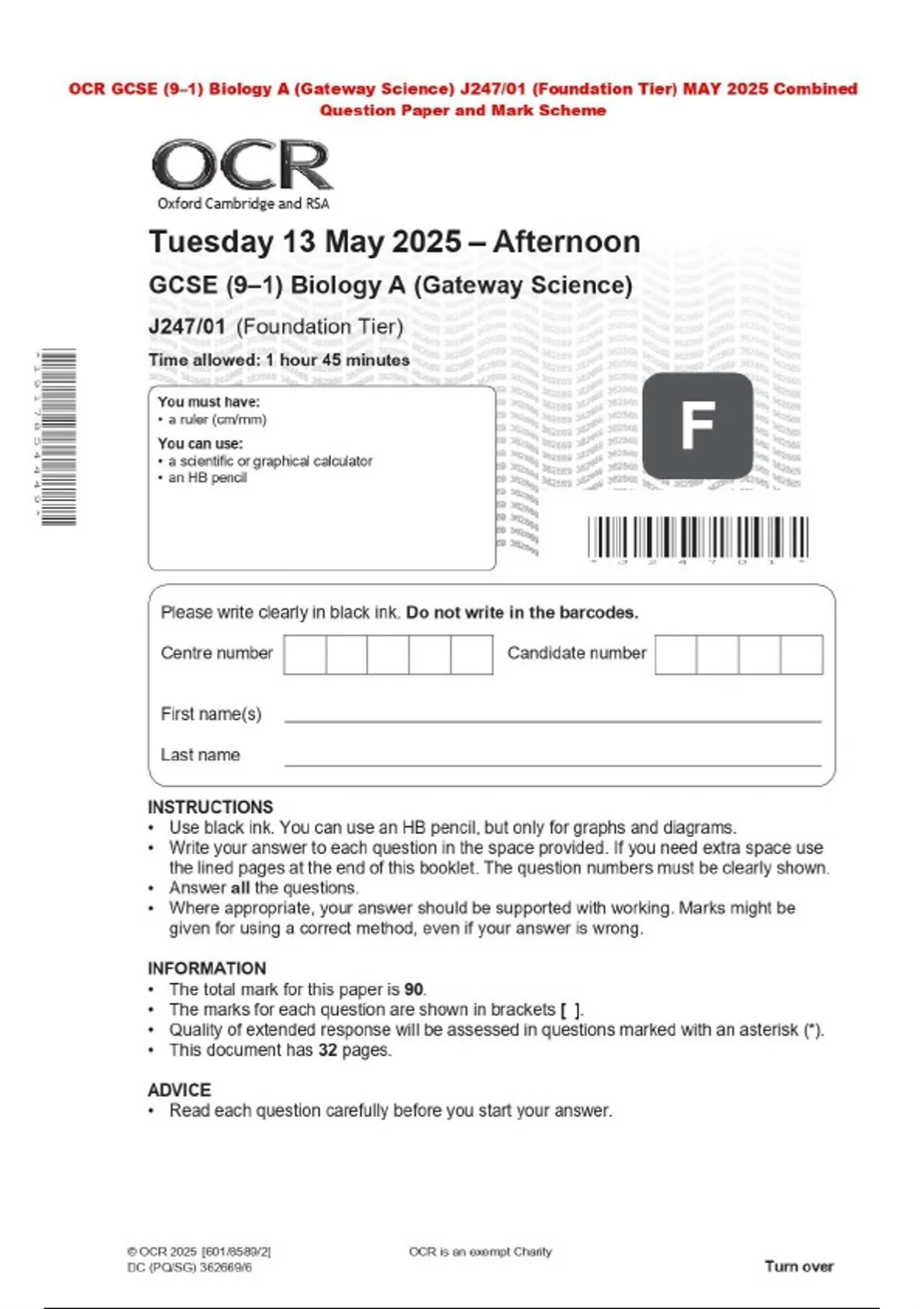 OCR GCSE (9–1) Biology A (Gateway Science) J247/01 (Foundation Tier) MAY 2025 Combined Question Paper and Mark Scheme